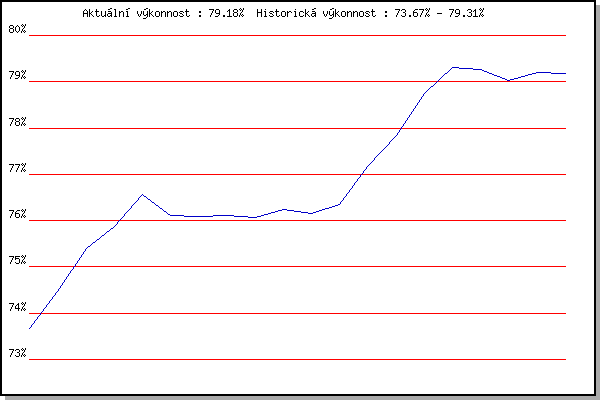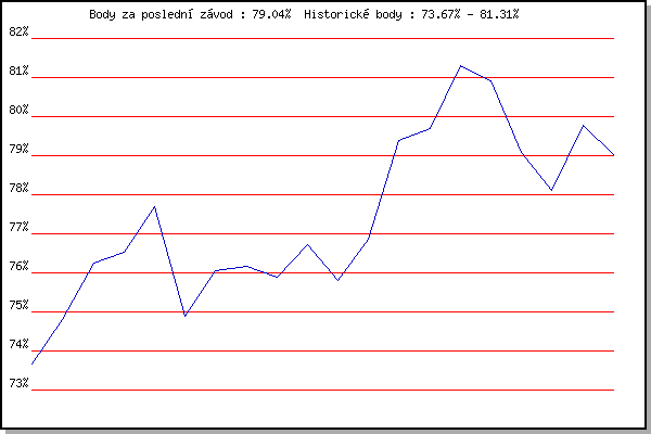 ZávodBodyVýkonnostZměna| 26.12.2007 | Syrovice | 73.67% | 73.67% | | | 5.1.2008 | Krenovice | 74.81% | 74.46% | +0.79% | | 19.1.2008 | Radostice | 76.26% | 75.39% | +0.93% | | 2.2.2008 | Kanice | 76.54% | 75.88% | +0.49% | | 16.2.2008 | Rajecko | 77.70% | 76.56% | +0.68% | | 1.3.2008 | Modrice | 74.88% | 76.11% | -0.45% | | 15.3.2008 | Myslivna | 76.06% | 76.10% | -0.01% | | 29.3.2008 | Cernohorsky soudek | 76.18% | 76.12% | +0.02% | | 22.11.2008 | 17.listopadu | 75.88% | 76.07% | -0.05% | | 6.12.2008 | Jehnice | 76.72% | 76.25% | +0.18% | | 26.12.2008 | Syrovice | 75.80% | 76.15% | -0.10% | | 4.4.2009 | Cernohorsky soudek | 76.85% | 76.34% | +0.19% | | 5.12.2009 | Okrouhla | 79.40% | 77.16% | +0.82% | | 26.12.2009 | Syrovice | 79.68% | 77.83% | +0.67% | | 9.1.2010 | Kurim | 81.31% | 78.75% | +0.92% | | 23.1.2010 | Radostice | 80.91% | 79.31% | +0.56% | | 6.2.2010 | Kanice | 79.07% | 79.26% | -0.05% | | 6.3.2010 | Modrice | 78.12% | 79.03% | -0.23% | | 21.3.2010 | Myslivna | 79.77% | 79.21% | +0.18% | | 3.4.2010 | Cernohorsky soudek | 79.04% | 79.18% | -0.03% | | | | |