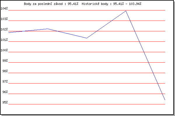 Závod| Body | Výkonnost | Změna | 17.11.2019 | Jehnice | 101.86% | 101.86% | | 30.11.2019 | Okrouhla | 102.22% | 102.11% | +0.25% | 14.12.2019 | Vranovsky zleb | 101.32% | 101.87% | -0.24% | 4.1.2020 | Kurim | 103.94% | 102.75% | +0.88% | 7.3.2020 | Modrice | 95.41% | 101.67% | -1.08% | | |