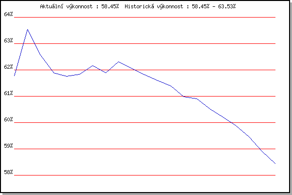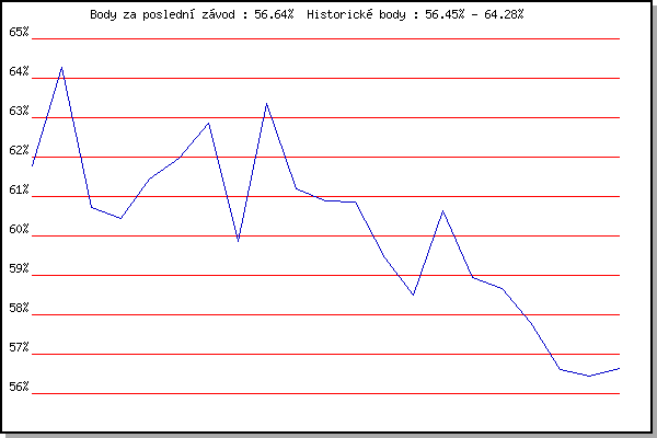 ZávodBodyVýkonnostZměna| 26.12.2007 | Syrovice | 61.78% | 61.77% | | | 26.12.2008 | Syrovice | 64.28% | 63.53% | +1.76% | | 7.2.2009 | Kanice | 60.71% | 62.55% | -0.98% | | 21.2.2009 | Rajecko | 60.44% | 61.89% | -0.66% | | 6.2.2010 | Kanice | 61.45% | 61.76% | -0.13% | | 20.2.2010 | Rajecko | 61.98% | 61.84% | +0.08% | | 6.3.2010 | Modrice | 62.87% | 62.17% | +0.33% | | 21.3.2010 | Myslivna | 59.86% | 61.88% | -0.29% | | 26.12.2010 | Syrovice | 63.35% | 62.31% | +0.43% | | 8.1.2011 | Kurim | 61.20% | 62.06% | -0.25% | | 26.3.2011 | Myslivna | 60.90% | 61.81% | -0.25% | | 26.12.2011 | Syrovice | 60.87% | 61.60% | -0.21% | | 17.11.2014 | Jehnice | 59.44% | 61.39% | -0.21% | | 13.12.2014 | Vranovsky zleb | 58.51% | 60.98% | -0.41% | | 26.12.2014 | Syrovice | 60.65% | 60.91% | -0.07% | | 7.2.2015 | Rajecko | 58.95% | 60.51% | -0.40% | | 12.12.2015 | Vranovsky zleb | 58.68% | 60.20% | -0.31% | | 26.12.2015 | Syrovice | 57.82% | 59.89% | -0.31% | | 9.1.2016 | Kurim | 56.60% | 59.47% | -0.42% | | 23.1.2016 | Radostice | 56.45% | 58.90% | -0.57% | | 12.3.2016 | Modrice | 56.64% | 58.45% | -0.45% | | | | |