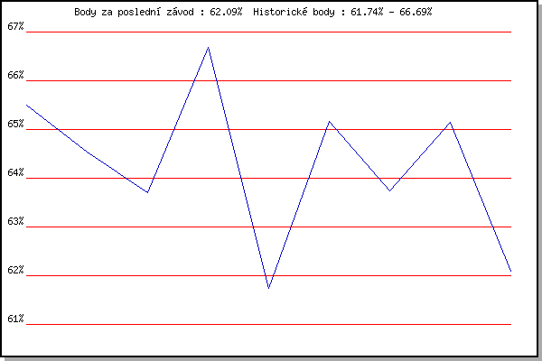 Závod| Body | Výkonnost | Změna | 5.1.2008 | Krenovice | 65.50% | 65.51% | | 26.12.2008 | Syrovice | 64.54% | 65.08% | -0.43% | 26.12.2011 | Syrovice | 63.71% | 64.64% | -0.44% | 26.12.2012 | Syrovice | 66.69% | 65.51% | +0.87% | 26.12.2013 | Syrovice | 61.74% | 64.81% | -0.70% | 26.12.2014 | Syrovice | 65.17% | 64.93% | +0.12% | 26.12.2015 | Syrovice | 63.75% | 64.63% | -0.30% | 26.12.2016 | Syrovice | 65.14% | 64.78% | +0.15% | 26.12.2018 | Syrovice | 62.09% | 64.40% | -0.38% | | |