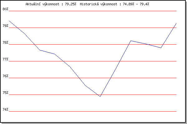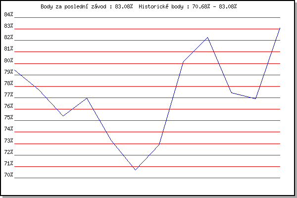 Závod| Body | Výkonnost | Změna | 2.2.2008 | Kanice | 79.40% | 79.40% | | 6.2.2010 | Kanice | 77.70% | 78.65% | -0.75% | 20.2.2010 | Rajecko | 75.40% | 77.67% | -0.98% | 3.4.2010 | Cernohorsky soudek | 76.97% | 77.43% | -0.24% | 19.2.2011 | Rajecko | 73.28% | 76.67% | -0.76% | 18.2.2012 | Rajecko | 70.68% | 75.55% | -1.12% | 11.3.2012 | Myslivna | 72.91% | 74.89% | -0.66% | 5.1.2013 | Kurim | 80.16% | 76.51% | +1.62% | 2.2.2013 | Rajecko | 82.29% | 78.22% | +1.71% | 15.3.2014 | Myslivna | 77.43% | 78.04% | -0.18% | 14.3.2015 | Myslivna | 76.93% | 77.80% | -0.24% | 12.12.2015 | Vranovsky zleb | 83.08% | 79.25% | +1.45% | | |