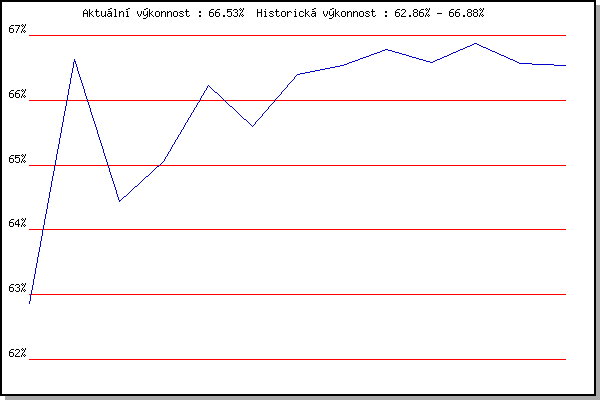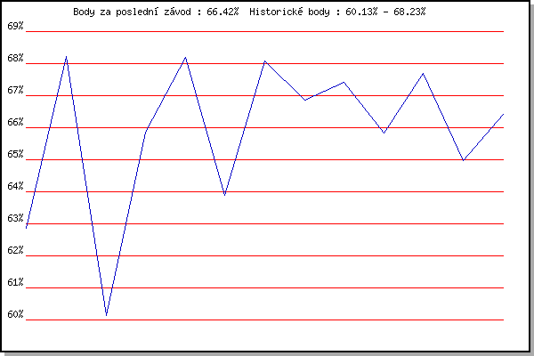 ZávodBodyVýkonnostZměna| 2.2.2008 | Kanice | 62.85% | 62.86% | | | 29.3.2008 | Cernohorsky soudek | 68.23% | 66.63% | +3.77% | | 22.11.2008 | 17.listopadu | 60.13% | 64.44% | -2.19% | | 6.12.2008 | Jehnice | 65.86% | 65.05% | +0.61% | | 26.12.2008 | Syrovice | 68.19% | 66.23% | +1.18% | | 21.3.2009 | Myslivna | 63.89% | 65.60% | -0.63% | | 21.11.2009 | 17.listopadu | 68.08% | 66.40% | +0.80% | | 5.12.2009 | Okrouhla | 66.85% | 66.54% | +0.14% | | 26.12.2009 | Syrovice | 67.42% | 66.79% | +0.25% | | 6.2.2010 | Kanice | 65.84% | 66.58% | -0.21% | | 6.3.2010 | Modrice | 67.68% | 66.88% | +0.30% | | 21.3.2010 | Myslivna | 64.97% | 66.56% | -0.32% | | 3.4.2010 | Cernohorsky soudek | 66.42% | 66.53% | -0.03% | | | | |