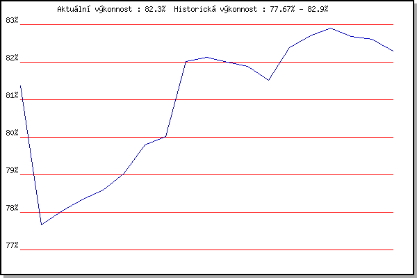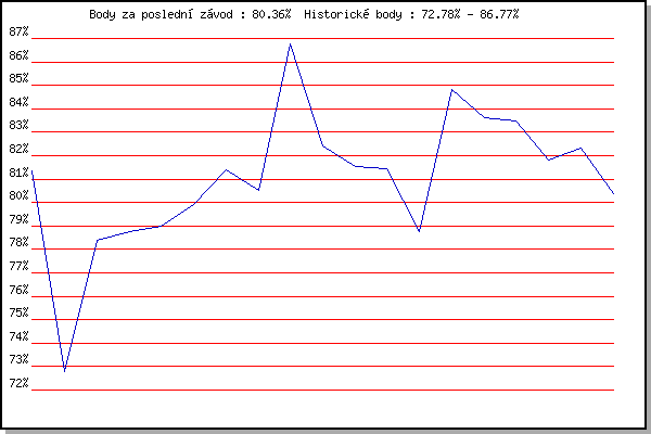 ZávodBodyVýkonnostZměna| 16.2.2008 | Rajecko | 81.37% | 81.37% | | | 8.1.2011 | Kurim | 72.78% | 77.67% | -3.70% | | 5.2.2011 | Kanice | 78.40% | 78.04% | +0.37% | | 19.2.2011 | Rajecko | 78.78% | 78.36% | +0.32% | | 5.3.2011 | Modrice | 78.98% | 78.59% | +0.23% | | 26.3.2011 | Myslivna | 79.93% | 79.04% | +0.45% | | 2.4.2011 | Cernohorsky soudek | 81.38% | 79.79% | +0.75% | | 26.12.2011 | Syrovice | 80.52% | 80.01% | +0.22% | | 7.1.2012 | Kurim | 86.77% | 82.02% | +2.01% | | 21.1.2012 | Radostice | 82.42% | 82.13% | +0.11% | | 11.3.2012 | Myslivna | 81.53% | 82.00% | -0.13% | | 26.12.2012 | Syrovice | 81.46% | 81.88% | -0.12% | | 5.1.2013 | Kurim | 78.77% | 81.51% | -0.37% | | 2.2.2013 | Rajecko | 84.80% | 82.38% | +0.87% | | 2.3.2013 | Vranovsky zleb | 83.60% | 82.70% | +0.32% | | 9.3.2013 | Modrice | 83.48% | 82.90% | +0.20% | | 30.11.2013 | Okrouhla | 81.82% | 82.69% | -0.21% | | 8.2.2014 | Rajecko | 82.31% | 82.61% | -0.08% | | 8.3.2014 | Modrice | 80.36% | 82.30% | -0.31% | | | | |