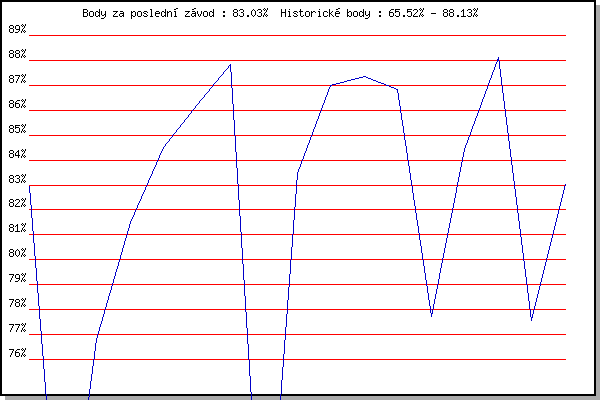 ZávodBodyVýkonnostZměna| 17.11.2007 | 17.listopadu | 82.95% | 82.95% | | | 1.12.2007 | Jehnice | 65.68% | 75.76% | -7.19% | | 5.1.2008 | Krenovice | 76.79% | 76.30% | +0.54% | | 19.1.2008 | Radostice | 81.51% | 78.55% | +2.25% | | 2.2.2008 | Kanice | 84.52% | 80.82% | +2.27% | | 1.3.2008 | Modrice | 86.21% | 82.69% | +1.87% | | 15.3.2008 | Myslivna | 87.82% | 84.34% | +1.65% | | 6.12.2008 | Jehnice | 65.52% | 82.27% | -2.07% | | 26.12.2008 | Syrovice | 83.48% | 82.63% | +0.36% | | 7.2.2009 | Kanice | 86.98% | 83.87% | +1.24% | | 21.2.2009 | Rajecko | 87.37% | 84.84% | +0.97% | | 7.3.2009 | Modrice | 86.85% | 85.39% | +0.55% | | 21.3.2009 | Myslivna | 77.73% | 83.83% | -1.56% | | 21.11.2009 | 17.listopadu | 84.42% | 83.98% | +0.15% | | 5.12.2009 | Okrouhla | 88.13% | 85.08% | +1.10% | | 26.12.2015 | Syrovice | 77.58% | 84.04% | -1.04% | | 7.3.2020 | Modrice | 83.03% | 83.83% | -0.21% | | | | |