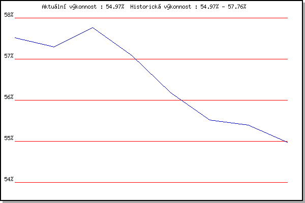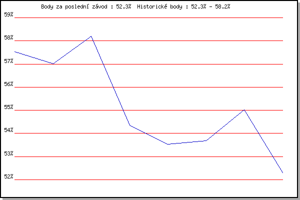 Závod| Body | Výkonnost | Změna | 16.2.2008 | Rajecko | 57.52% | 57.52% | | 21.2.2009 | Rajecko | 57.01% | 57.30% | -0.22% | 4.12.2010 | Okrouhla | 58.20% | 57.76% | +0.46% | 3.12.2011 | Okrouhla | 54.35% | 57.08% | -0.68% | 2.2.2013 | Rajecko | 53.54% | 56.19% | -0.89% | 30.11.2013 | Okrouhla | 53.69% | 55.52% | -0.67% | 8.2.2014 | Rajecko | 55.03% | 55.40% | -0.12% | 3.12.2016 | Okrouhla | 52.30% | 54.97% | -0.43% | | |