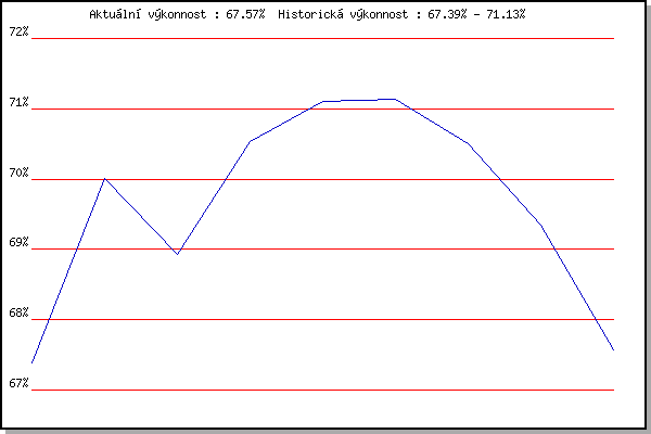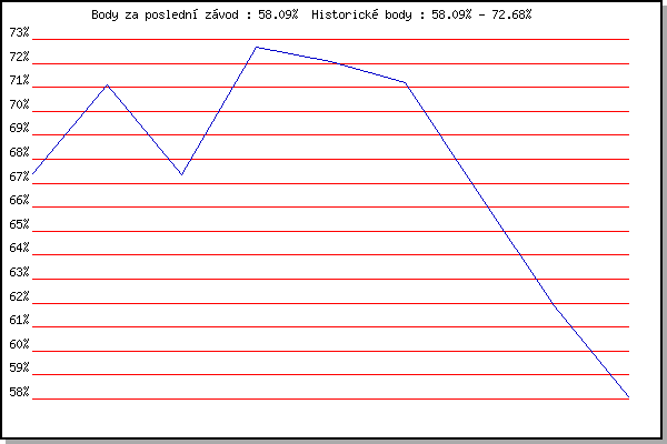 Závod| Body | Výkonnost | Změna | 1.3.2008 | Modrice | 67.39% | 67.39% | | 26.12.2008 | Syrovice | 71.12% | 70.01% | +2.62% | 24.1.2009 | Radostice | 67.35% | 68.93% | -1.08% | 7.2.2009 | Kanice | 72.68% | 70.54% | +1.61% | 7.3.2009 | Modrice | 72.05% | 71.11% | +0.57% | 21.3.2009 | Myslivna | 71.20% | 71.13% | +0.02% | 6.3.2010 | Modrice | 66.54% | 70.51% | -0.62% | 5.3.2011 | Modrice | 61.88% | 69.35% | -1.16% | 12.3.2016 | Modrice | 58.09% | 67.57% | -1.78% | | |