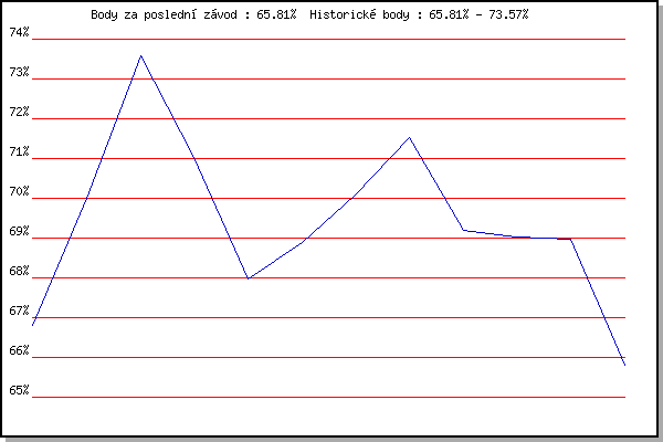 Závod| Body | Výkonnost | Změna | 1.3.2008 | Modrice | 66.81% | 66.81% | | 7.3.2009 | Modrice | 70.01% | 69.05% | +2.24% | 5.3.2011 | Modrice | 73.57% | 71.41% | +2.36% | 9.3.2013 | Modrice | 71.04% | 71.28% | -0.13% | 8.3.2014 | Modrice | 67.96% | 70.47% | -0.81% | 15.3.2014 | Myslivna | 68.90% | 70.05% | -0.42% | 7.3.2015 | Modrice | 70.07% | 70.06% | +0.01% | 14.3.2015 | Myslivna | 71.52% | 70.50% | +0.44% | 12.3.2016 | Modrice | 69.20% | 70.20% | -0.30% | 4.3.2017 | Modrice | 69.04% | 69.95% | -0.25% | 9.3.2019 | Modrice | 68.96% | 69.75% | -0.20% | 7.3.2020 | Modrice | 65.81% | 69.53% | -0.22% | | |