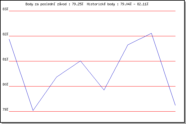 Závod| Body | Výkonnost | Změna | 17.11.2007 | 17.listopadu | 81.88% | 81.88% | | 19.1.2008 | Radostice | 79.04% | 80.63% | -1.25% | 2.2.2008 | Kanice | 80.37% | 80.52% | -0.11% | 16.2.2008 | Rajecko | 81.01% | 80.73% | +0.21% | 1.3.2008 | Modrice | 79.85% | 80.48% | -0.25% | 15.3.2008 | Myslivna | 81.66% | 80.88% | +0.40% | 29.3.2008 | Cernohorsky soudek | 82.11% | 81.27% | +0.39% | 26.12.2008 | Syrovice | 79.25% | 80.98% | -0.29% | | |