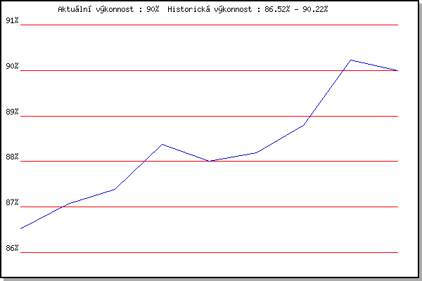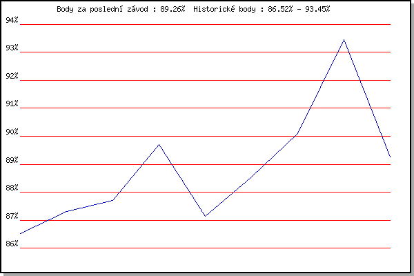 Závod| Body | Výkonnost | Změna | 22.11.2008 | 17.listopadu | 86.52% | 86.52% | | 6.12.2008 | Jehnice | 87.30% | 87.06% | +0.54% | 26.12.2008 | Syrovice | 87.71% | 87.39% | +0.33% | 26.12.2009 | Syrovice | 89.71% | 88.38% | +0.99% | 17.11.2010 | 17.listopadu | 87.13% | 88.01% | -0.37% | 4.12.2010 | Okrouhla | 88.54% | 88.19% | +0.18% | 26.12.2010 | Syrovice | 90.11% | 88.80% | +0.61% | 8.1.2011 | Kurim | 93.45% | 90.22% | +1.42% | 26.12.2012 | Syrovice | 89.26% | 90.00% | -0.22% | | |
