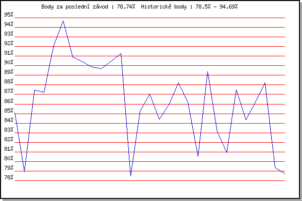 ZávodBodyVýkonnostZměna| 22.11.2008 | 17.listopadu | 85.10% | 85.10% | | | 9.1.2010 | Kurim | 78.96% | 82.43% | -2.67% | | 17.11.2010 | 17.listopadu | 87.45% | 85.04% | +2.61% | | 4.12.2010 | Okrouhla | 87.26% | 85.99% | +0.95% | | 26.12.2010 | Syrovice | 92.08% | 88.31% | +2.32% | | 8.1.2011 | Kurim | 94.69% | 90.52% | +2.21% | | 22.1.2011 | Radostice | 90.89% | 90.64% | +0.12% | | 5.2.2011 | Kanice | 90.42% | 90.59% | -0.05% | | 19.2.2011 | Rajecko | 89.85% | 90.42% | -0.17% | | 26.3.2011 | Myslivna | 89.72% | 90.26% | -0.16% | | 2.4.2011 | Cernohorsky soudek | 90.49% | 90.32% | +0.06% | | 17.11.2011 | Jehnice | 91.27% | 90.58% | +0.26% | | 21.1.2012 | Radostice | 78.50% | 90.11% | -0.47% | | 4.2.2012 | Kanice | 85.30% | 89.12% | -0.99% | | 18.2.2012 | Rajecko | 87.03% | 88.70% | -0.42% | | 11.3.2012 | Myslivna | 84.40% | 87.83% | -0.87% | | 17.11.2012 | Jehnice | 85.92% | 87.44% | -0.39% | | 26.12.2012 | Syrovice | 88.21% | 87.64% | +0.20% | | 19.1.2013 | Radostice | 86.12% | 87.33% | -0.31% | | 9.3.2013 | Modrice | 80.52% | 86.72% | -0.61% | | 6.4.2013 | Soudek Vinice | 89.39% | 87.40% | +0.68% | | 30.11.2013 | Okrouhla | 83.16% | 86.56% | -0.84% | | 26.12.2013 | Syrovice | 80.93% | 85.68% | -0.88% | | 13.12.2014 | Vranovsky zleb | 87.50% | 86.14% | +0.46% | | 26.12.2014 | Syrovice | 84.35% | 85.78% | -0.36% | | 3.1.2015 | Kurim | 86.18% | 85.88% | +0.10% | | 17.1.2015 | Radostice | 88.24% | 86.48% | +0.60% | | 26.12.2017 | Syrovice | 79.35% | 85.92% | -0.56% | | 6.1.2018 | Kurim | 78.74% | 84.65% | -1.27% | | | | |