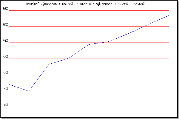 Závod| Body | Výkonnost | Změna | 22.11.2008 | 17.listopadu | 61.40% | 61.40% | | 26.12.2009 | Syrovice | 60.46% | 60.98% | -0.42% | 9.1.2010 | Kurim | 64.19% | 62.65% | +1.67% | 23.1.2010 | Radostice | 63.56% | 63.03% | +0.38% | 6.2.2010 | Kanice | 65.29% | 63.88% | +0.85% | 20.2.2010 | Rajecko | 64.44% | 64.07% | +0.19% | 6.3.2010 | Modrice | 65.68% | 64.58% | +0.51% | 21.3.2010 | Myslivna | 66.45% | 65.15% | +0.57% | 3.4.2010 | Cernohorsky soudek | 66.95% | 65.68% | +0.53% | | |