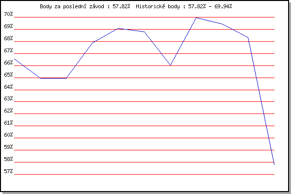 Závod| Body | Výkonnost | Změna | 6.12.2008 | Jehnice | 66.56% | 66.57% | | 26.12.2008 | Syrovice | 64.96% | 65.86% | -0.71% | 24.1.2009 | Radostice | 64.93% | 65.48% | -0.38% | 7.2.2009 | Kanice | 67.86% | 66.50% | +1.02% | 21.2.2009 | Rajecko | 69.07% | 67.47% | +0.97% | 7.3.2009 | Modrice | 68.80% | 67.93% | +0.46% | 21.3.2009 | Myslivna | 66.01% | 67.45% | -0.48% | 4.4.2009 | Cernohorsky soudek | 69.94% | 68.21% | +0.76% | 21.11.2009 | 17.listopadu | 69.42% | 68.56% | +0.35% | 9.1.2010 | Kurim | 68.31% | 68.51% | -0.05% | 3.3.2012 | Modrice | 57.82% | 68.01% | -0.50% | | |