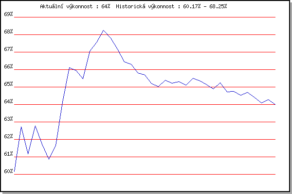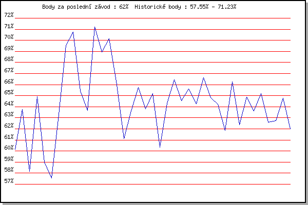 ZávodBodyVýkonnostZměna| 6.12.2008 | Jehnice | 60.17% | 60.17% | | | 26.12.2008 | Syrovice | 63.78% | 62.71% | +2.54% | | 21.3.2009 | Myslivna | 58.15% | 61.17% | -1.54% | | 21.11.2009 | 17.listopadu | 64.93% | 62.79% | +1.62% | | 20.2.2010 | Rajecko | 59.00% | 61.72% | -1.07% | | 21.3.2010 | Myslivna | 57.55% | 60.87% | -0.85% | | 17.11.2010 | 17.listopadu | 63.32% | 61.65% | +0.78% | | 26.12.2010 | Syrovice | 69.56% | 64.13% | +2.48% | | 22.1.2011 | Radostice | 70.74% | 66.11% | +1.98% | | 26.3.2011 | Myslivna | 65.42% | 65.95% | -0.16% | | 21.1.2012 | Radostice | 63.68% | 65.47% | -0.48% | | 26.12.2012 | Syrovice | 71.23% | 67.06% | +1.59% | | 24.3.2013 | Myslivna | 68.96% | 67.56% | +0.50% | | 26.12.2013 | Syrovice | 70.15% | 68.25% | +0.69% | | 18.1.2014 | Radostice | 66.00% | 67.79% | -0.46% | | 17.11.2015 | Jehnice | 61.12% | 67.16% | -0.63% | | 12.12.2015 | Vranovsky zleb | 63.62% | 66.45% | -0.71% | | 26.12.2015 | Syrovice | 65.76% | 66.31% | -0.14% | | 9.1.2016 | Kurim | 63.80% | 65.81% | -0.50% | | 23.1.2016 | Radostice | 65.20% | 65.69% | -0.12% | | 19.3.2016 | Myslivna | 60.35% | 65.20% | -0.49% | | 3.4.2016 | Brnenska prehrada | 64.32% | 65.02% | -0.18% | | 17.11.2016 | Jehnice | 66.45% | 65.38% | +0.36% | | 26.12.2016 | Syrovice | 64.55% | 65.22% | -0.16% | | 21.1.2017 | Radostice | 65.62% | 65.31% | +0.09% | | 4.3.2017 | Modrice | 64.25% | 65.10% | -0.21% | | 25.3.2017 | Myslivna | 66.65% | 65.49% | +0.39% | | 2.4.2017 | Brnenska prehrada | 64.81% | 65.35% | -0.14% | | 17.11.2017 | Jehnice | 64.22% | 65.13% | -0.22% | | 9.12.2017 | Vranovsky zleb | 61.88% | 64.90% | -0.23% | | 26.12.2017 | Syrovice | 66.28% | 65.25% | +0.35% | | 6.1.2018 | Kurim | 62.35% | 64.71% | -0.54% | | 20.1.2018 | Radostice | 64.86% | 64.75% | +0.04% | | 27.1.2018 | Rajecko | 63.63% | 64.52% | -0.23% | | 17.2.2018 | Modrice | 65.21% | 64.69% | +0.17% | | 25.3.2018 | Brnenska prehrada | 62.60% | 64.41% | -0.28% | | 17.11.2018 | Jehnice | 62.76% | 64.09% | -0.32% | | 1.12.2018 | Okrouhla | 64.80% | 64.27% | +0.18% | | 17.11.2019 | Jehnice | 62.00% | 64.00% | -0.27% | | | | |