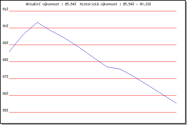 Závod| Body | Výkonnost | Změna | 24.1.2009 | Radostice | 88.59% | 88.59% | | 7.2.2009 | Kanice | 90.06% | 89.61% | +1.02% | 21.2.2009 | Rajecko | 91.01% | 90.33% | +0.72% | 7.3.2009 | Modrice | 88.70% | 89.83% | -0.50% | 6.3.2010 | Modrice | 87.76% | 89.38% | -0.45% | 17.11.2011 | Jehnice | 86.89% | 88.87% | -0.51% | 21.1.2012 | Radostice | 85.21% | 88.27% | -0.60% | 3.3.2012 | Modrice | 85.94% | 87.71% | -0.56% | 11.3.2012 | Myslivna | 87.07% | 87.56% | -0.15% | 1.12.2012 | Okrouhla | 83.22% | 87.09% | -0.47% | 9.3.2013 | Modrice | 84.83% | 86.60% | -0.49% | 30.11.2013 | Okrouhla | 84.10% | 86.07% | -0.53% | 8.3.2014 | Modrice | 81.32% | 85.54% | -0.53% | | |
