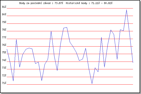 ZávodBodyVýkonnostZměna| 24.1.2009 | Radostice | 75.64% | 75.64% | | | 4.4.2009 | Cernohorsky soudek | 73.81% | 74.83% | -0.81% | | 9.1.2010 | Kurim | 71.48% | 73.82% | -1.01% | | 23.1.2010 | Radostice | 76.93% | 75.15% | +1.33% | | 20.2.2010 | Rajecko | 73.30% | 74.61% | -0.54% | | 21.3.2010 | Myslivna | 74.95% | 74.73% | +0.12% | | 8.1.2011 | Kurim | 75.63% | 75.01% | +0.28% | | 5.2.2011 | Kanice | 75.77% | 75.24% | +0.23% | | 19.2.2011 | Rajecko | 75.70% | 75.37% | +0.13% | | 5.3.2011 | Modrice | 73.75% | 75.10% | -0.27% | | 2.4.2011 | Cernohorsky soudek | 73.93% | 74.85% | -0.25% | | 17.11.2011 | Jehnice | 71.49% | 74.58% | -0.27% | | 2.3.2013 | Vranovsky zleb | 73.66% | 74.38% | -0.20% | | 9.3.2013 | Modrice | 74.29% | 74.36% | -0.02% | | 24.3.2013 | Myslivna | 78.02% | 75.33% | +0.97% | | 17.11.2013 | Jehnice | 74.80% | 75.22% | -0.11% | | 30.11.2013 | Okrouhla | 72.82% | 74.82% | -0.40% | | 14.12.2013 | Vranovsky zleb | 76.31% | 75.20% | +0.38% | | 4.1.2014 | Kurim | 78.41% | 76.03% | +0.83% | | 18.1.2014 | Radostice | 78.50% | 76.66% | +0.63% | | 8.3.2014 | Modrice | 76.56% | 76.64% | -0.02% | | 15.3.2014 | Myslivna | 75.97% | 76.50% | -0.14% | | 17.11.2014 | Jehnice | 75.22% | 76.25% | -0.25% | | 13.12.2014 | Vranovsky zleb | 74.11% | 75.99% | -0.26% | | 26.12.2014 | Syrovice | 74.32% | 75.66% | -0.33% | | 3.1.2015 | Kurim | 75.75% | 75.68% | +0.02% | | 17.1.2015 | Radostice | 73.17% | 75.44% | -0.24% | | 7.3.2015 | Modrice | 71.11% | 74.99% | -0.45% | | 14.3.2015 | Myslivna | 73.18% | 74.63% | -0.36% | | 26.12.2015 | Syrovice | 72.68% | 74.24% | -0.39% | | 10.12.2016 | Vranovsky zleb | 77.21% | 75.00% | +0.76% | | 25.3.2017 | Myslivna | 73.30% | 74.67% | -0.33% | | 2.12.2017 | Okrouhla | 76.26% | 75.07% | +0.40% | | 6.1.2018 | Kurim | 78.17% | 75.86% | +0.79% | | 20.1.2018 | Radostice | 77.56% | 76.28% | +0.42% | | 17.11.2018 | Jehnice | 74.31% | 75.89% | -0.39% | | 15.12.2018 | Vranovsky zleb | 78.19% | 76.47% | +0.58% | | 26.12.2018 | Syrovice | 78.08% | 76.88% | +0.41% | | 5.1.2019 | Kurim | 80.82% | 77.88% | +1.00% | | 17.11.2019 | Jehnice | 77.58% | 77.83% | -0.05% | | 7.3.2020 | Modrice | 73.87% | 77.40% | -0.43% | | | | |