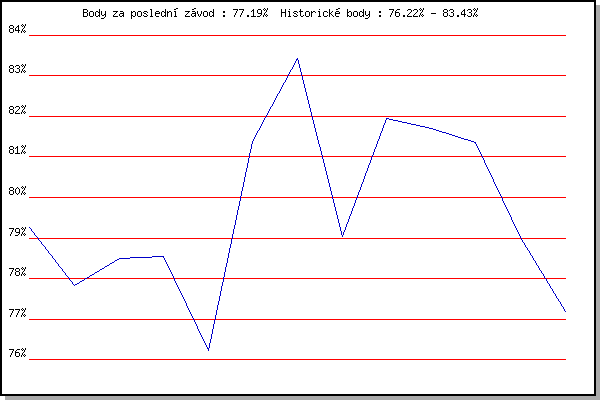 ZávodBodyVýkonnostZměna| 17.11.2007 | 17.listopadu | 79.27% | 79.27% | | | 16.2.2008 | Rajecko | 77.82% | 78.63% | -0.64% | | 1.3.2008 | Modrice | 78.50% | 78.57% | -0.06% | | 22.11.2008 | 17.listopadu | 78.54% | 78.56% | -0.01% | | 26.12.2008 | Syrovice | 76.22% | 78.22% | -0.34% | | 5.3.2011 | Modrice | 81.38% | 79.30% | +1.08% | | 26.12.2011 | Syrovice | 83.43% | 80.63% | +1.33% | | 8.3.2014 | Modrice | 79.04% | 80.25% | -0.38% | | 26.12.2014 | Syrovice | 81.95% | 80.75% | +0.50% | | 7.3.2015 | Modrice | 81.71% | 81.02% | +0.27% | | 26.12.2015 | Syrovice | 81.36% | 81.11% | +0.09% | | 4.3.2017 | Modrice | 79.01% | 80.73% | -0.38% | | 2.12.2017 | Okrouhla | 77.19% | 80.35% | -0.38% | | | | |