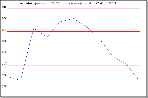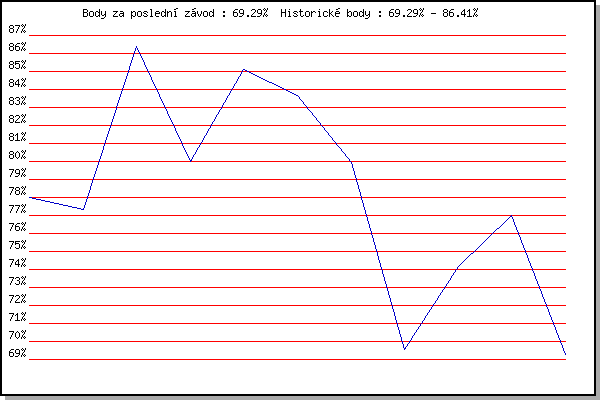 Závod| Body | Výkonnost | Změna | 21.2.2009 | Rajecko | 77.99% | 77.99% | | 4.4.2009 | Cernohorsky soudek | 77.31% | 77.69% | -0.30% | 6.2.2010 | Kanice | 86.41% | 82.27% | +4.58% | 20.2.2010 | Rajecko | 79.98% | 81.50% | -0.77% | 3.4.2010 | Cernohorsky soudek | 85.10% | 82.86% | +1.36% | 26.3.2011 | Myslivna | 83.64% | 83.13% | +0.27% | 17.11.2012 | Jehnice | 79.94% | 82.39% | -0.74% | 1.12.2012 | Okrouhla | 69.56% | 81.33% | -1.06% | 5.12.2015 | Okrouhla | 74.19% | 79.74% | -1.59% | 12.12.2015 | Vranovsky zleb | 77.02% | 79.14% | -0.60% | 3.4.2016 | Brnenska prehrada | 69.29% | 77.60% | -1.54% | | |