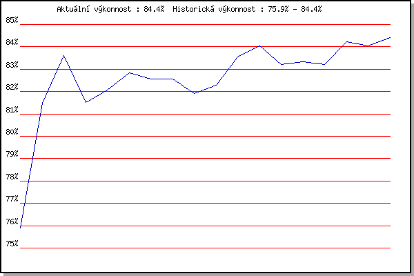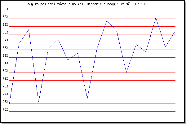 ZávodBodyVýkonnostZměna| 21.2.2009 | Rajecko | 75.90% | 75.90% | | | 17.11.2010 | 17.listopadu | 83.80% | 81.47% | +5.57% | | 4.12.2010 | Okrouhla | 85.61% | 83.61% | +2.14% | | 26.12.2010 | Syrovice | 76.20% | 81.50% | -2.11% | | 8.1.2011 | Kurim | 83.05% | 82.08% | +0.58% | | 22.1.2011 | Radostice | 84.33% | 82.85% | +0.77% | | 19.2.2011 | Rajecko | 81.68% | 82.55% | -0.30% | | 5.3.2011 | Modrice | 82.56% | 82.55% | 0.00% | | 26.3.2011 | Myslivna | 76.70% | 81.92% | -0.63% | | 17.11.2011 | Jehnice | 83.23% | 82.29% | +0.37% | | 3.12.2011 | Okrouhla | 86.76% | 83.54% | +1.25% | | 26.12.2011 | Syrovice | 85.40% | 84.04% | +0.50% | | 7.1.2012 | Kurim | 80.06% | 83.22% | -0.82% | | 18.2.2012 | Rajecko | 83.66% | 83.33% | +0.11% | | 17.11.2012 | Jehnice | 82.69% | 83.20% | -0.13% | | 1.12.2012 | Okrouhla | 87.13% | 84.23% | +1.03% | | 6.2.2016 | Rajecko | 83.33% | 84.04% | -0.19% | | 2.12.2017 | Okrouhla | 85.45% | 84.40% | +0.36% | | | | |