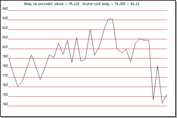 ZávodBodyVýkonnostZměna| 17.11.2007 | 17.listopadu | 79.04% | 79.04% | | | 1.12.2007 | Jehnice | 77.38% | 78.31% | -0.73% | | 26.12.2007 | Syrovice | 76.06% | 77.59% | -0.72% | | 5.1.2008 | Krenovice | 76.56% | 77.24% | -0.35% | | 19.1.2008 | Radostice | 77.94% | 77.50% | +0.26% | | 2.2.2008 | Kanice | 79.33% | 78.12% | +0.62% | | 16.2.2008 | Rajecko | 78.10% | 78.12% | 0.00% | | 15.3.2008 | Myslivna | 76.78% | 77.87% | -0.25% | | 29.3.2008 | Cernohorsky soudek | 78.03% | 77.92% | +0.05% | | 22.11.2008 | 17.listopadu | 79.36% | 78.32% | +0.40% | | 6.12.2008 | Jehnice | 79.05% | 78.52% | +0.20% | | 26.12.2008 | Syrovice | 80.56% | 79.07% | +0.55% | | 7.2.2009 | Kanice | 79.41% | 79.16% | +0.09% | | 21.2.2009 | Rajecko | 80.84% | 79.60% | +0.44% | | 7.3.2009 | Modrice | 78.55% | 79.39% | -0.21% | | 21.3.2009 | Myslivna | 81.16% | 79.84% | +0.45% | | 21.11.2009 | 17.listopadu | 78.68% | 79.61% | -0.23% | | 5.12.2009 | Okrouhla | 78.93% | 79.47% | -0.14% | | 26.12.2009 | Syrovice | 82.02% | 80.12% | +0.65% | | 6.2.2010 | Kanice | 79.33% | 79.96% | -0.16% | | 20.2.2010 | Rajecko | 80.13% | 80.01% | +0.05% | | 6.3.2010 | Modrice | 81.84% | 80.47% | +0.46% | | 21.3.2010 | Myslivna | 83.09% | 81.14% | +0.67% | | 3.4.2010 | Cernohorsky soudek | 83.10% | 81.64% | +0.50% | | 17.11.2010 | 17.listopadu | 79.98% | 81.31% | -0.33% | | 26.12.2010 | Syrovice | 79.57% | 81.02% | -0.29% | | 8.1.2011 | Kurim | 79.94% | 80.81% | -0.21% | | 22.1.2011 | Radostice | 78.66% | 80.58% | -0.23% | | 5.2.2011 | Kanice | 80.52% | 80.57% | -0.01% | | 19.2.2011 | Rajecko | 81.06% | 80.69% | +0.12% | | 5.3.2011 | Modrice | 80.87% | 80.73% | +0.04% | | 2.4.2011 | Cernohorsky soudek | 80.87% | 80.77% | +0.04% | | 18.2.2012 | Rajecko | 74.63% | 80.58% | -0.19% | | 3.3.2012 | Modrice | 78.23% | 80.11% | -0.47% | | 17.11.2013 | Jehnice | 74.35% | 79.18% | -0.93% | | 30.11.2013 | Okrouhla | 75.22% | 78.41% | -0.77% | | | | |