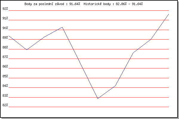 Závod| Body | Výkonnost | Změna | 7.3.2009 | Modrice | 89.39% | 89.39% | | 6.3.2010 | Modrice | 87.93% | 88.74% | -0.65% | 19.2.2011 | Rajecko | 89.26% | 89.01% | +0.27% | 5.3.2011 | Modrice | 90.27% | 89.54% | +0.53% | 17.11.2011 | Jehnice | 86.64% | 89.02% | -0.52% | 3.12.2011 | Okrouhla | 82.86% | 88.06% | -0.96% | 6.4.2013 | Soudek Vinice | 84.19% | 87.09% | -0.97% | 8.3.2014 | Modrice | 87.63% | 87.25% | +0.16% | 7.3.2015 | Modrice | 89.00% | 87.76% | +0.51% | 17.2.2018 | Modrice | 91.64% | 88.87% | +1.11% | | |