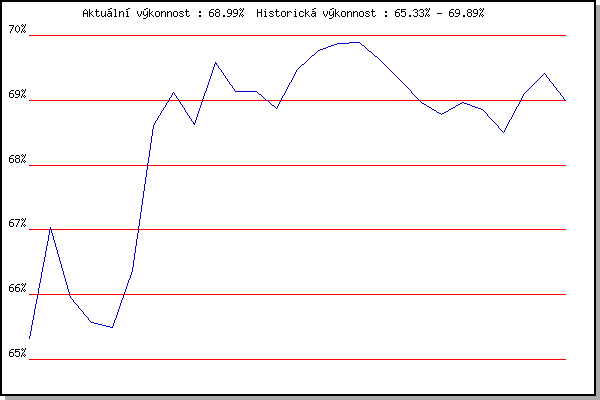 ZávodBodyVýkonnostZměna| 21.3.2009 | Myslivna | 65.33% | 65.33% | | | 21.11.2009 | 17.listopadu | 67.78% | 67.04% | +1.71% | | 20.2.2010 | Rajecko | 63.83% | 65.96% | -1.08% | | 6.3.2010 | Modrice | 64.81% | 65.57% | -0.39% | | 21.3.2010 | Myslivna | 65.32% | 65.50% | -0.07% | | 26.3.2011 | Myslivna | 68.05% | 66.37% | +0.87% | | 31.3.2012 | Cernohorsky soudek | 73.21% | 68.61% | +2.24% | | 26.12.2013 | Syrovice | 70.28% | 69.12% | +0.51% | | 18.1.2014 | Radostice | 66.99% | 68.63% | -0.49% | | 3.4.2016 | Brnenska prehrada | 71.99% | 69.58% | +0.95% | | 17.11.2016 | Jehnice | 67.51% | 69.14% | -0.44% | | 26.12.2016 | Syrovice | 69.17% | 69.14% | 0.00% | | 21.1.2017 | Radostice | 67.92% | 68.88% | -0.26% | | 4.3.2017 | Modrice | 71.14% | 69.48% | +0.60% | | 25.3.2017 | Myslivna | 70.56% | 69.76% | +0.28% | | 2.4.2017 | Brnenska prehrada | 70.20% | 69.88% | +0.12% | | 17.11.2017 | Jehnice | 69.89% | 69.89% | +0.01% | | 9.12.2017 | Vranovsky zleb | 61.89% | 69.63% | -0.26% | | 26.12.2017 | Syrovice | 68.04% | 69.31% | -0.32% | | 6.1.2018 | Kurim | 67.59% | 68.96% | -0.35% | | 20.1.2018 | Radostice | 68.04% | 68.78% | -0.18% | | 27.1.2018 | Rajecko | 69.53% | 68.97% | +0.19% | | 17.2.2018 | Modrice | 68.38% | 68.85% | -0.12% | | 25.3.2018 | Brnenska prehrada | 67.14% | 68.51% | -0.34% | | 17.11.2018 | Jehnice | 70.82% | 69.10% | +0.59% | | 26.12.2018 | Syrovice | 70.34% | 69.41% | +0.31% | | 17.11.2019 | Jehnice | 65.92% | 68.99% | -0.42% | | | | |