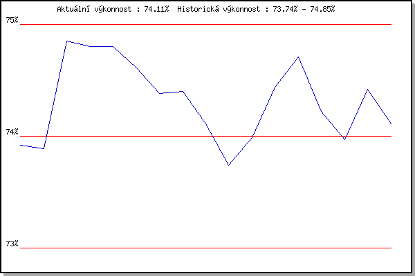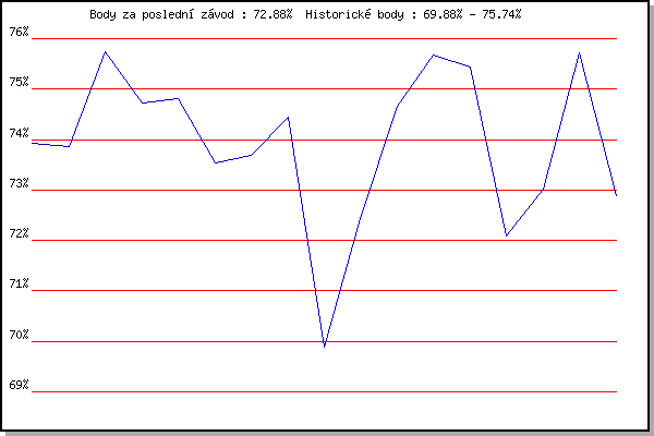 ZávodBodyVýkonnostZměna| 21.11.2009 | 17.listopadu | 73.92% | 73.92% | | | 5.12.2009 | Okrouhla | 73.85% | 73.89% | -0.03% | | 26.12.2009 | Syrovice | 75.74% | 74.85% | +0.96% | | 9.1.2010 | Kurim | 74.72% | 74.80% | -0.05% | | 23.1.2010 | Radostice | 74.80% | 74.80% | 0.00% | | 20.2.2010 | Rajecko | 73.54% | 74.61% | -0.19% | | 6.3.2010 | Modrice | 73.69% | 74.38% | -0.23% | | 3.4.2010 | Cernohorsky soudek | 74.45% | 74.40% | +0.02% | | 17.11.2010 | 17.listopadu | 69.88% | 74.11% | -0.29% | | 8.1.2011 | Kurim | 72.43% | 73.74% | -0.37% | | 22.1.2011 | Radostice | 74.65% | 73.99% | +0.25% | | 5.2.2011 | Kanice | 75.68% | 74.44% | +0.45% | | 5.3.2011 | Modrice | 75.44% | 74.71% | +0.27% | | 3.12.2011 | Okrouhla | 72.10% | 74.22% | -0.49% | | 7.1.2012 | Kurim | 73.02% | 73.97% | -0.25% | | 21.1.2012 | Radostice | 75.71% | 74.42% | +0.45% | | 3.3.2012 | Modrice | 72.88% | 74.11% | -0.31% | | | | |