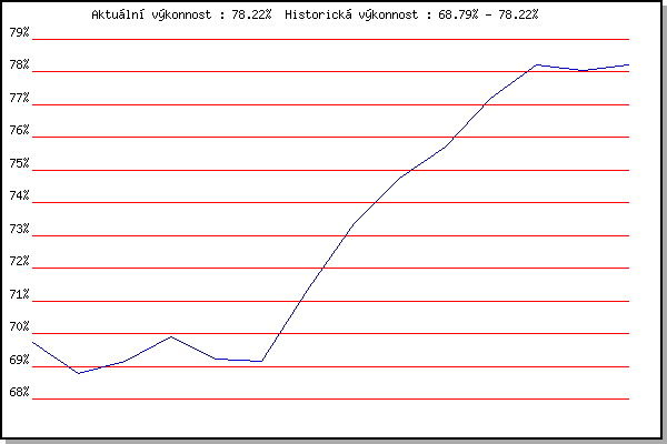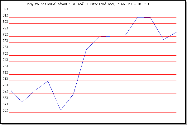 ZávodBodyVýkonnostZměna| 21.11.2009 | 17.listopadu | 69.74% | 69.74% | | | 5.12.2009 | Okrouhla | 67.59% | 68.79% | -0.95% | | 26.12.2009 | Syrovice | 69.48% | 69.14% | +0.35% | | 6.2.2010 | Kanice | 70.95% | 69.91% | +0.77% | | 20.2.2010 | Rajecko | 66.35% | 69.23% | -0.68% | | 3.4.2010 | Cernohorsky soudek | 68.89% | 69.14% | -0.09% | | 22.1.2011 | Radostice | 75.86% | 71.33% | +2.19% | | 5.2.2011 | Kanice | 77.90% | 73.36% | +2.03% | | 19.2.2011 | Rajecko | 78.05% | 74.75% | +1.39% | | 5.3.2011 | Modrice | 78.06% | 75.69% | +0.94% | | 17.11.2011 | Jehnice | 81.03% | 77.19% | +1.50% | | 26.12.2011 | Syrovice | 80.94% | 78.21% | +1.02% | | 4.2.2012 | Kanice | 77.50% | 78.06% | -0.15% | | 17.11.2018 | Jehnice | 78.65% | 78.22% | +0.16% | | | | |