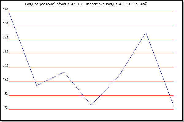 Závod| Body | Výkonnost | Změna | 21.11.2009 | 17.listopadu | 53.85% | 53.85% | | 26.12.2009 | Syrovice | 48.71% | 51.62% | -2.23% | 9.1.2010 | Kurim | 49.65% | 50.82% | -0.80% | 20.2.2010 | Rajecko | 47.32% | 49.95% | -0.87% | 21.3.2010 | Myslivna | 49.33% | 49.77% | -0.18% | 26.12.2010 | Syrovice | 52.47% | 50.71% | +0.94% | 8.1.2011 | Kurim | 47.33% | 50.07% | -0.64% | | |