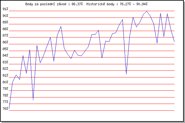 ZávodBodyVýkonnostZměna| 26.12.2009 | Syrovice | 76.27% | 76.26% | | | 9.1.2010 | Kurim | 80.25% | 79.05% | +2.79% | | 17.11.2011 | Jehnice | 81.35% | 80.24% | +1.19% | | 3.12.2011 | Okrouhla | 80.67% | 80.42% | +0.18% | | 26.12.2011 | Syrovice | 84.30% | 81.89% | +1.47% | | 21.1.2012 | Radostice | 81.59% | 81.81% | -0.08% | | 4.2.2012 | Kanice | 85.16% | 82.89% | +1.08% | | 18.2.2012 | Rajecko | 77.57% | 82.13% | -0.76% | | 11.3.2012 | Myslivna | 85.80% | 83.20% | +1.07% | | 1.12.2012 | Okrouhla | 83.18% | 83.20% | 0.00% | | 26.12.2012 | Syrovice | 84.27% | 83.49% | +0.29% | | 5.1.2013 | Kurim | 85.74% | 84.10% | +0.61% | | 19.1.2013 | Radostice | 87.00% | 84.88% | +0.78% | | 2.2.2013 | Rajecko | 83.42% | 84.58% | -0.30% | | 2.3.2013 | Vranovsky zleb | 87.29% | 85.29% | +0.71% | | 24.3.2013 | Myslivna | 88.68% | 86.17% | +0.88% | | 30.11.2013 | Okrouhla | 85.31% | 86.00% | -0.17% | | 14.12.2013 | Vranovsky zleb | 84.49% | 85.70% | -0.30% | | 26.12.2013 | Syrovice | 83.83% | 85.32% | -0.38% | | 4.1.2014 | Kurim | 85.07% | 85.27% | -0.05% | | 18.1.2014 | Radostice | 84.34% | 85.08% | -0.19% | | 8.2.2014 | Rajecko | 84.22% | 84.91% | -0.17% | | 17.11.2014 | Jehnice | 84.93% | 84.91% | 0.00% | | 13.12.2014 | Vranovsky zleb | 85.65% | 85.09% | +0.18% | | 26.12.2014 | Syrovice | 87.45% | 85.69% | +0.60% | | 3.1.2015 | Kurim | 87.43% | 86.13% | +0.44% | | 17.1.2015 | Radostice | 88.06% | 86.61% | +0.48% | | 17.11.2015 | Jehnice | 83.91% | 86.30% | -0.31% | | 5.12.2015 | Okrouhla | 86.44% | 86.34% | +0.04% | | 12.12.2015 | Vranovsky zleb | 86.38% | 86.35% | +0.01% | | 26.12.2015 | Syrovice | 87.55% | 86.65% | +0.30% | | 23.1.2016 | Radostice | 87.72% | 86.92% | +0.27% | | 6.2.2016 | Rajecko | 88.87% | 87.41% | +0.49% | | 3.4.2016 | Brnenska prehrada | 89.71% | 87.99% | +0.58% | | 7.1.2017 | Kurim | 81.45% | 87.61% | -0.38% | | 21.1.2017 | Radostice | 87.19% | 87.52% | -0.09% | | 11.2.2017 | Rajecko | 90.03% | 88.16% | +0.64% | | 2.4.2017 | Brnenska prehrada | 88.57% | 88.26% | +0.10% | | 17.11.2017 | Jehnice | 89.28% | 88.52% | +0.26% | | 2.12.2017 | Okrouhla | 90.45% | 89.01% | +0.49% | | 9.12.2017 | Vranovsky zleb | 90.94% | 89.49% | +0.48% | | 26.12.2017 | Syrovice | 90.19% | 89.67% | +0.18% | | 6.1.2018 | Kurim | 89.06% | 89.54% | -0.13% | | 17.11.2018 | Jehnice | 86.13% | 89.15% | -0.39% | | 5.1.2019 | Kurim | 90.65% | 89.53% | +0.38% | | 19.1.2019 | Radostice | 87.13% | 89.06% | -0.47% | | 16.3.2019 | Myslivna | 90.59% | 89.44% | +0.38% | | 4.1.2020 | Kurim | 88.12% | 89.18% | -0.26% | | 18.1.2020 | Radostice | 86.37% | 88.84% | -0.34% | | | | |