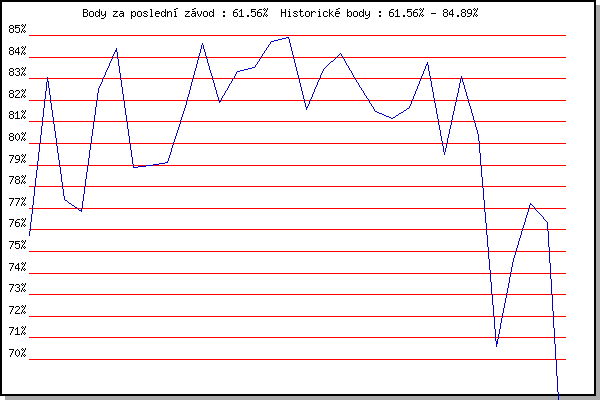 ZávodBodyVýkonnostZměna| 23.1.2010 | Radostice | 75.73% | 75.73% | | | 21.3.2010 | Myslivna | 83.03% | 80.87% | +5.14% | | 5.2.2011 | Kanice | 77.40% | 79.47% | -1.40% | | 5.3.2011 | Modrice | 76.87% | 78.59% | -0.88% | | 7.1.2012 | Kurim | 82.48% | 80.06% | +1.47% | | 3.3.2012 | Modrice | 84.41% | 81.56% | +1.50% | | 17.11.2013 | Jehnice | 78.90% | 80.89% | -0.67% | | 30.11.2013 | Okrouhla | 78.99% | 80.44% | -0.45% | | 8.3.2014 | Modrice | 79.14% | 80.14% | -0.30% | | 15.3.2014 | Myslivna | 81.71% | 80.59% | +0.45% | | 17.11.2015 | Jehnice | 84.64% | 81.71% | +1.12% | | 4.3.2017 | Modrice | 81.89% | 81.76% | +0.05% | | 17.11.2017 | Jehnice | 83.31% | 82.18% | +0.42% | | 2.12.2017 | Okrouhla | 83.53% | 82.53% | +0.35% | | 20.1.2018 | Radostice | 84.70% | 83.10% | +0.57% | | 27.1.2018 | Rajecko | 84.89% | 83.56% | +0.46% | | 17.2.2018 | Modrice | 81.59% | 83.16% | -0.40% | | 10.3.2018 | Myslivna | 83.40% | 83.22% | +0.06% | | 17.11.2018 | Jehnice | 84.18% | 83.47% | +0.25% | | 1.12.2018 | Okrouhla | 82.81% | 83.34% | -0.13% | | 15.12.2018 | Vranovsky zleb | 81.49% | 83.12% | -0.22% | | 5.1.2019 | Kurim | 81.16% | 82.79% | -0.33% | | 19.1.2019 | Radostice | 81.65% | 82.57% | -0.22% | | 26.1.2019 | Rajecko | 83.73% | 82.86% | +0.29% | | 9.3.2019 | Modrice | 79.50% | 82.59% | -0.27% | | 16.3.2019 | Myslivna | 83.11% | 82.72% | +0.13% | | 7.4.2019 | Brnenska prehrada | 80.37% | 82.25% | -0.47% | | 30.11.2019 | Okrouhla | 70.62% | 81.84% | -0.41% | | 14.12.2019 | Vranovsky zleb | 74.62% | 80.44% | -1.40% | | 4.1.2020 | Kurim | 77.21% | 79.81% | -0.63% | | 18.1.2020 | Radostice | 76.36% | 79.13% | -0.68% | | 7.3.2020 | Modrice | 61.56% | 78.01% | -1.12% | | | | |