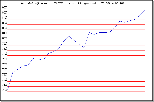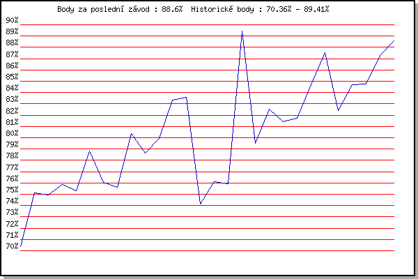 ZávodBodyVýkonnostZměna| 6.2.2010 | Kanice | 70.36% | 70.36% | | | 6.3.2010 | Modrice | 75.12% | 73.70% | +3.34% | | 21.3.2010 | Myslivna | 74.93% | 74.33% | +0.63% | | 17.11.2010 | 17.listopadu | 75.89% | 74.99% | +0.66% | | 8.1.2011 | Kurim | 75.33% | 75.12% | +0.13% | | 5.2.2011 | Kanice | 78.85% | 76.40% | +1.28% | | 5.3.2011 | Modrice | 76.04% | 76.31% | -0.09% | | 4.2.2012 | Kanice | 75.62% | 76.14% | -0.17% | | 5.1.2013 | Kurim | 80.37% | 77.39% | +1.25% | | 19.1.2013 | Radostice | 78.67% | 77.75% | +0.36% | | 2.2.2013 | Rajecko | 79.92% | 78.35% | +0.60% | | 14.12.2013 | Vranovsky zleb | 83.33% | 79.72% | +1.37% | | 15.3.2014 | Myslivna | 83.56% | 80.75% | +1.03% | | 17.1.2015 | Radostice | 74.13% | 79.99% | -0.76% | | 7.2.2015 | Rajecko | 76.12% | 79.21% | -0.78% | | 7.3.2015 | Modrice | 75.93% | 78.54% | -0.67% | | 17.11.2015 | Jehnice | 89.41% | 81.46% | +2.92% | | 23.1.2016 | Radostice | 79.50% | 81.07% | -0.39% | | 6.2.2016 | Rajecko | 82.54% | 81.44% | +0.37% | | 3.12.2016 | Okrouhla | 81.43% | 81.44% | 0.00% | | 21.1.2017 | Radostice | 81.73% | 81.52% | +0.08% | | 25.3.2017 | Myslivna | 84.68% | 82.32% | +0.80% | | 17.11.2017 | Jehnice | 87.55% | 83.67% | +1.35% | | 6.1.2018 | Kurim | 82.39% | 83.41% | -0.26% | | 25.3.2018 | Brnenska prehrada | 84.66% | 83.73% | +0.32% | | 19.1.2019 | Radostice | 84.73% | 83.98% | +0.25% | | 26.1.2019 | Rajecko | 87.31% | 84.82% | +0.84% | | 9.3.2019 | Modrice | 88.60% | 85.78% | +0.96% | | | | |