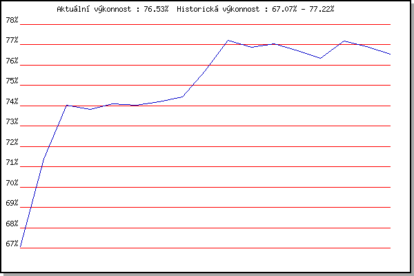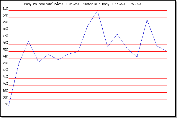 ZávodBodyVýkonnostZměna| 6.2.2010 | Kanice | 67.07% | 67.07% | | | 17.11.2010 | 17.listopadu | 73.18% | 71.37% | +4.30% | | 8.1.2011 | Kurim | 76.50% | 74.04% | +2.67% | | 5.2.2011 | Kanice | 73.44% | 73.84% | -0.20% | | 19.2.2011 | Rajecko | 74.57% | 74.11% | +0.27% | | 5.3.2011 | Modrice | 73.78% | 74.02% | -0.09% | | 2.4.2011 | Cernohorsky soudek | 74.61% | 74.21% | +0.19% | | 17.11.2011 | Jehnice | 74.95% | 74.43% | +0.22% | | 7.1.2012 | Kurim | 78.81% | 75.72% | +1.29% | | 4.2.2012 | Kanice | 80.94% | 77.22% | +1.50% | | 3.3.2012 | Modrice | 75.62% | 76.87% | -0.35% | | 31.3.2012 | Cernohorsky soudek | 77.55% | 77.05% | +0.18% | | 8.2.2014 | Rajecko | 75.38% | 76.70% | -0.35% | | 14.3.2015 | Myslivna | 74.16% | 76.33% | -0.37% | | 11.2.2017 | Rajecko | 79.60% | 77.19% | +0.86% | | 6.1.2018 | Kurim | 75.80% | 76.90% | -0.29% | | 4.1.2020 | Kurim | 75.05% | 76.53% | -0.37% | | | | |