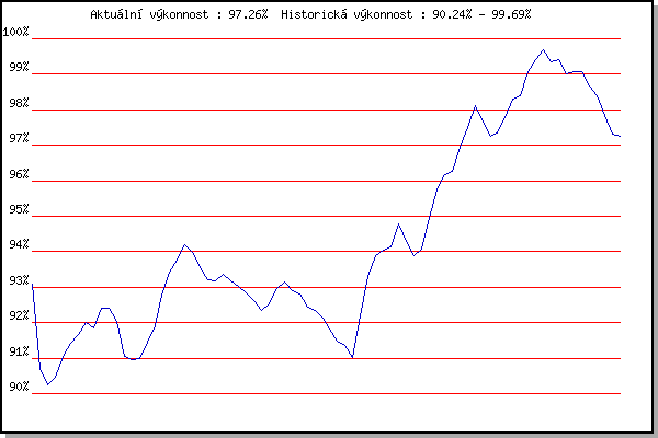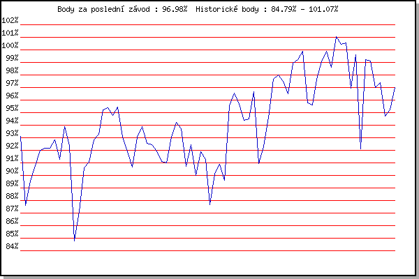ZávodBodyVýkonnostZměna| 17.11.2007 | 17.listopadu | 93.10% | 93.10% | | | 2.2.2008 | Kanice | 87.62% | 90.70% | -2.40% | | 16.2.2008 | Rajecko | 89.57% | 90.24% | -0.46% | | 1.3.2008 | Modrice | 90.77% | 90.47% | +0.23% | | 15.3.2008 | Myslivna | 92.00% | 91.04% | +0.57% | | 29.3.2008 | Cernohorsky soudek | 92.19% | 91.43% | +0.39% | | 22.11.2008 | 17.listopadu | 92.14% | 91.66% | +0.23% | | 6.12.2008 | Jehnice | 92.85% | 92.02% | +0.36% | | 26.12.2008 | Syrovice | 91.27% | 91.85% | -0.17% | | 24.1.2009 | Radostice | 93.88% | 92.42% | +0.57% | | 7.2.2009 | Kanice | 92.34% | 92.41% | -0.01% | | 21.2.2009 | Rajecko | 84.79% | 92.05% | -0.36% | | 7.3.2009 | Modrice | 87.14% | 91.04% | -1.01% | | 21.3.2009 | Myslivna | 90.62% | 90.95% | -0.09% | | 4.4.2009 | Cernohorsky soudek | 91.05% | 90.98% | +0.03% | | 21.11.2009 | 17.listopadu | 92.81% | 91.45% | +0.47% | | 26.12.2009 | Syrovice | 93.25% | 91.91% | +0.46% | | 9.1.2010 | Kurim | 95.24% | 92.77% | +0.86% | | 23.1.2010 | Radostice | 95.39% | 93.44% | +0.67% | | 6.2.2010 | Kanice | 94.79% | 93.78% | +0.34% | | 20.2.2010 | Rajecko | 95.42% | 94.20% | +0.42% | | 6.3.2010 | Modrice | 93.06% | 93.97% | -0.23% | | 21.3.2010 | Myslivna | 91.89% | 93.55% | -0.42% | | 3.4.2010 | Cernohorsky soudek | 90.68% | 93.20% | -0.35% | | 8.1.2011 | Kurim | 93.03% | 93.17% | -0.03% | | 22.1.2011 | Radostice | 93.88% | 93.35% | +0.18% | | 5.2.2011 | Kanice | 92.58% | 93.19% | -0.16% | | 19.2.2011 | Rajecko | 92.45% | 93.04% | -0.15% | | 5.3.2011 | Modrice | 91.96% | 92.83% | -0.21% | | 26.3.2011 | Myslivna | 91.11% | 92.64% | -0.19% | | 2.4.2011 | Cernohorsky soudek | 91.00% | 92.34% | -0.30% | | 21.1.2012 | Radostice | 93.06% | 92.53% | +0.19% | | 4.2.2012 | Kanice | 94.24% | 92.96% | +0.43% | | 18.2.2012 | Rajecko | 93.74% | 93.16% | +0.20% | | 3.3.2012 | Modrice | 90.70% | 92.89% | -0.27% | | 11.3.2012 | Myslivna | 92.42% | 92.80% | -0.09% | | 31.3.2012 | Cernohorsky soudek | 90.00% | 92.45% | -0.35% | | 17.11.2012 | Jehnice | 91.89% | 92.34% | -0.11% | | 1.12.2012 | Okrouhla | 91.29% | 92.13% | -0.21% | | 5.1.2013 | Kurim | 87.68% | 91.82% | -0.31% | | 19.1.2013 | Radostice | 90.14% | 91.49% | -0.33% | | 2.2.2013 | Rajecko | 90.87% | 91.37% | -0.12% | | 24.3.2013 | Myslivna | 89.62% | 91.02% | -0.35% | | 17.11.2015 | Jehnice | 95.57% | 92.18% | +1.16% | | 5.12.2015 | Okrouhla | 96.56% | 93.30% | +1.12% | | 12.12.2015 | Vranovsky zleb | 95.69% | 93.90% | +0.60% | | 26.12.2015 | Syrovice | 94.41% | 94.03% | +0.13% | | 23.1.2016 | Radostice | 94.48% | 94.14% | +0.11% | | 6.2.2016 | Rajecko | 96.66% | 94.77% | +0.63% | | 12.3.2016 | Modrice | 90.92% | 94.28% | -0.49% | | 19.3.2016 | Myslivna | 92.27% | 93.88% | -0.40% | | 3.4.2016 | Brnenska prehrada | 94.60% | 94.06% | +0.18% | | 17.11.2016 | Jehnice | 97.67% | 94.98% | +0.92% | | 3.12.2016 | Okrouhla | 97.97% | 95.73% | +0.75% | | 10.12.2016 | Vranovsky zleb | 97.51% | 96.18% | +0.45% | | 26.12.2016 | Syrovice | 96.51% | 96.27% | +0.09% | | 7.1.2017 | Kurim | 98.95% | 96.94% | +0.67% | | 21.1.2017 | Radostice | 99.20% | 97.51% | +0.57% | | 11.2.2017 | Rajecko | 99.87% | 98.11% | +0.60% | | 4.3.2017 | Modrice | 95.76% | 97.64% | -0.47% | | 25.3.2017 | Myslivna | 95.60% | 97.24% | -0.40% | | 2.4.2017 | Brnenska prehrada | 97.65% | 97.34% | +0.10% | | 17.11.2017 | Jehnice | 99.04% | 97.77% | +0.43% | | 2.12.2017 | Okrouhla | 99.90% | 98.30% | +0.53% | | 9.12.2017 | Vranovsky zleb | 98.63% | 98.38% | +0.08% | | 6.1.2018 | Kurim | 101.07% | 99.06% | +0.68% | | 20.1.2018 | Radostice | 100.42% | 99.40% | +0.34% | | 27.1.2018 | Rajecko | 100.56% | 99.69% | +0.29% | | 17.2.2018 | Modrice | 96.92% | 99.34% | -0.35% | | 10.3.2018 | Myslivna | 99.58% | 99.40% | +0.06% | | 25.3.2018 | Brnenska prehrada | 92.13% | 99.01% | -0.39% | | 17.11.2018 | Jehnice | 99.22% | 99.06% | +0.05% | | 1.12.2018 | Okrouhla | 99.09% | 99.07% | +0.01% | | 15.12.2018 | Vranovsky zleb | 97.00% | 98.66% | -0.41% | | 19.1.2019 | Radostice | 97.39% | 98.40% | -0.26% | | 26.1.2019 | Rajecko | 94.71% | 97.85% | -0.55% | | 9.3.2019 | Modrice | 95.21% | 97.32% | -0.53% | | 7.4.2019 | Brnenska prehrada | 96.98% | 97.26% | -0.06% | | | | |