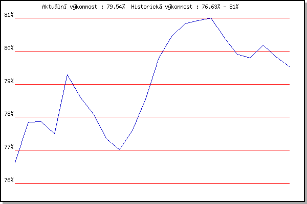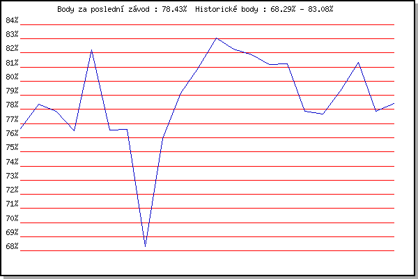 ZávodBodyVýkonnostZměna| 17.11.2007 | 17.listopadu | 76.63% | 76.63% | | | 1.12.2007 | Jehnice | 78.38% | 77.85% | +1.22% | | 26.12.2007 | Syrovice | 77.88% | 77.86% | +0.01% | | 5.1.2008 | Krenovice | 76.48% | 77.50% | -0.36% | | 19.1.2008 | Radostice | 82.23% | 79.29% | +1.79% | | 16.2.2008 | Rajecko | 76.53% | 78.60% | -0.69% | | 6.12.2008 | Jehnice | 76.58% | 78.10% | -0.50% | | 26.12.2008 | Syrovice | 68.29% | 77.34% | -0.76% | | 7.2.2009 | Kanice | 75.96% | 77.02% | -0.32% | | 21.2.2009 | Rajecko | 79.15% | 77.62% | +0.60% | | 21.3.2009 | Myslivna | 80.96% | 78.55% | +0.93% | | 5.12.2009 | Okrouhla | 83.08% | 79.79% | +1.24% | | 26.12.2009 | Syrovice | 82.28% | 80.45% | +0.66% | | 9.1.2010 | Kurim | 81.88% | 80.83% | +0.38% | | 21.3.2010 | Myslivna | 81.18% | 80.92% | +0.09% | | 3.4.2010 | Cernohorsky soudek | 81.23% | 81.00% | +0.08% | | 4.12.2010 | Okrouhla | 77.87% | 80.43% | -0.57% | | 8.1.2011 | Kurim | 77.68% | 79.91% | -0.52% | | 22.1.2011 | Radostice | 79.29% | 79.79% | -0.12% | | 5.2.2011 | Kanice | 81.33% | 80.18% | +0.39% | | 19.2.2011 | Rajecko | 77.87% | 79.82% | -0.36% | | 5.3.2011 | Modrice | 78.43% | 79.54% | -0.28% | | | | |