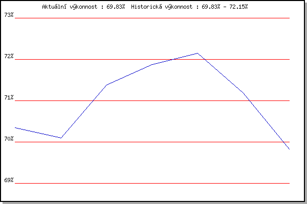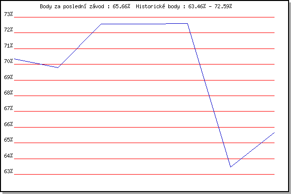 Závod| Body | Výkonnost | Změna | 20.2.2010 | Rajecko | 70.35% | 70.35% | | 6.3.2010 | Modrice | 69.78% | 70.10% | -0.25% | 21.3.2010 | Myslivna | 72.57% | 71.38% | +1.28% | 3.4.2010 | Cernohorsky soudek | 72.56% | 71.88% | +0.50% | 22.1.2011 | Radostice | 72.59% | 72.15% | +0.27% | 19.2.2011 | Rajecko | 63.46% | 71.18% | -0.97% | 17.11.2011 | Jehnice | 65.66% | 69.83% | -1.35% | | |