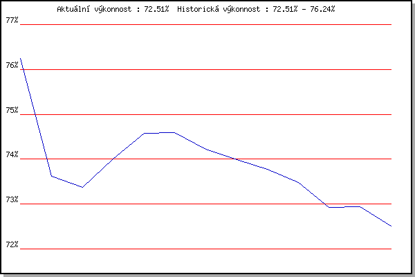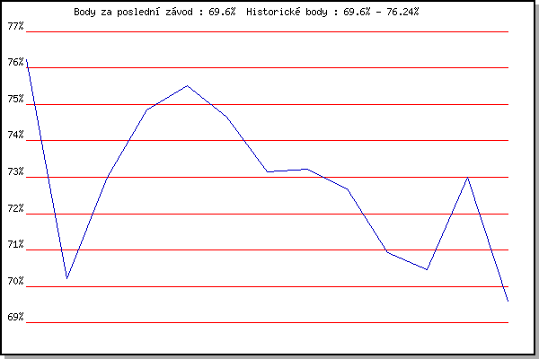 ZávodBodyVýkonnostZměna| 17.11.2007 | 17.listopadu | 76.24% | 76.24% | | | 1.12.2007 | Jehnice | 70.20% | 73.62% | -2.62% | | 26.12.2008 | Syrovice | 73.00% | 73.37% | -0.25% | | 24.1.2009 | Radostice | 74.86% | 74.00% | +0.63% | | 21.3.2009 | Myslivna | 75.51% | 74.57% | +0.57% | | 21.11.2009 | 17.listopadu | 74.65% | 74.59% | +0.02% | | 17.11.2010 | 17.listopadu | 73.15% | 74.23% | -0.36% | | 4.12.2010 | Okrouhla | 73.23% | 73.99% | -0.24% | | 26.12.2010 | Syrovice | 72.67% | 73.78% | -0.21% | | 8.1.2011 | Kurim | 70.93% | 73.48% | -0.30% | | 5.2.2011 | Kanice | 70.46% | 72.92% | -0.56% | | 26.3.2011 | Myslivna | 72.99% | 72.94% | +0.02% | | 17.11.2013 | Jehnice | 69.60% | 72.51% | -0.43% | | | | |