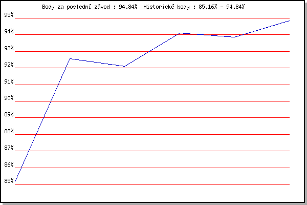 Závod| Body | Výkonnost | Změna | 17.11.2010 | 17.listopadu | 85.16% | 85.16% | | 17.11.2014 | Jehnice | 92.56% | 90.37% | +5.21% | 7.3.2015 | Modrice | 92.09% | 91.25% | +0.88% | 17.11.2015 | Jehnice | 94.10% | 92.47% | +1.22% | 12.3.2016 | Modrice | 93.87% | 92.99% | +0.52% | 25.3.2018 | Brnenska prehrada | 94.84% | 93.62% | +0.63% | | |