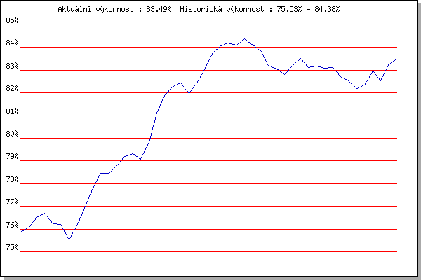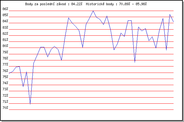 ZávodBodyVýkonnostZměna| 17.11.2007 | 17.listopadu | 75.86% | 75.86% | | | 26.12.2007 | Syrovice | 76.19% | 76.09% | +0.23% | | 5.1.2008 | Krenovice | 76.90% | 76.50% | +0.41% | | 19.1.2008 | Radostice | 76.97% | 76.70% | +0.20% | | 2.2.2008 | Kanice | 73.71% | 76.24% | -0.46% | | 16.2.2008 | Rajecko | 76.14% | 76.22% | -0.02% | | 15.3.2008 | Myslivna | 70.89% | 75.53% | -0.69% | | 29.3.2008 | Cernohorsky soudek | 77.53% | 76.14% | +0.61% | | 26.12.2008 | Syrovice | 78.73% | 76.90% | +0.76% | | 24.1.2009 | Radostice | 80.14% | 77.82% | +0.92% | | 21.2.2009 | Rajecko | 80.11% | 78.45% | +0.63% | | 7.3.2009 | Modrice | 78.52% | 78.47% | +0.02% | | 21.3.2009 | Myslivna | 79.71% | 78.80% | +0.33% | | 4.4.2009 | Cernohorsky soudek | 80.29% | 79.20% | +0.40% | | 21.11.2009 | 17.listopadu | 79.73% | 79.33% | +0.13% | | 5.12.2009 | Okrouhla | 77.98% | 79.06% | -0.27% | | 26.12.2009 | Syrovice | 81.91% | 79.80% | +0.74% | | 23.1.2010 | Radostice | 84.87% | 81.12% | +1.32% | | 6.2.2010 | Kanice | 84.06% | 81.87% | +0.75% | | 20.2.2010 | Rajecko | 83.48% | 82.28% | +0.41% | | 6.3.2010 | Modrice | 82.85% | 82.43% | +0.15% | | 21.3.2010 | Myslivna | 80.08% | 81.96% | -0.47% | | 3.4.2010 | Cernohorsky soudek | 83.80% | 82.43% | +0.47% | | 17.11.2010 | 17.listopadu | 84.74% | 83.01% | +0.58% | | 4.12.2010 | Okrouhla | 85.98% | 83.77% | +0.76% | | 26.12.2010 | Syrovice | 84.94% | 84.07% | +0.30% | | 8.1.2011 | Kurim | 84.62% | 84.20% | +0.13% | | 22.1.2011 | Radostice | 83.76% | 84.11% | -0.09% | | 5.2.2011 | Kanice | 85.18% | 84.38% | +0.27% | | 19.2.2011 | Rajecko | 82.94% | 84.10% | -0.28% | | 5.3.2011 | Modrice | 79.67% | 83.85% | -0.25% | | 26.3.2011 | Myslivna | 80.62% | 83.22% | -0.63% | | 2.4.2011 | Cernohorsky soudek | 82.38% | 83.05% | -0.17% | | 17.11.2011 | Jehnice | 81.85% | 82.81% | -0.24% | | 3.12.2011 | Okrouhla | 84.40% | 83.21% | +0.40% | | 26.12.2011 | Syrovice | 84.42% | 83.52% | +0.31% | | 4.2.2012 | Kanice | 77.65% | 83.12% | -0.40% | | 17.11.2012 | Jehnice | 83.38% | 83.19% | +0.07% | | 1.12.2012 | Okrouhla | 82.76% | 83.10% | -0.09% | | 26.12.2012 | Syrovice | 83.15% | 83.11% | +0.01% | | 5.1.2013 | Kurim | 81.16% | 82.73% | -0.38% | | 2.2.2013 | Rajecko | 81.80% | 82.54% | -0.19% | | 26.12.2013 | Syrovice | 79.99% | 82.18% | -0.36% | | 6.12.2014 | Okrouhla | 82.79% | 82.33% | +0.15% | | 26.12.2014 | Syrovice | 84.75% | 82.95% | +0.62% | | 26.12.2015 | Syrovice | 79.63% | 82.52% | -0.43% | | 26.12.2016 | Syrovice | 85.38% | 83.25% | +0.73% | | 26.12.2019 | Syrovice | 84.22% | 83.49% | +0.24% | | | | |