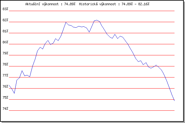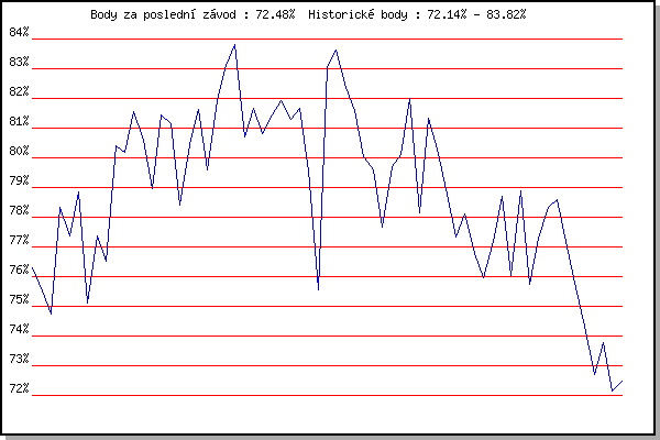 ZávodBodyVýkonnostZměna| 17.11.2010 | 17.listopadu | 76.28% | 76.28% | | | 4.12.2010 | Okrouhla | 75.53% | 75.95% | -0.33% | | 26.12.2010 | Syrovice | 74.73% | 75.56% | -0.39% | | 8.1.2011 | Kurim | 78.33% | 76.75% | +1.19% | | 22.1.2011 | Radostice | 77.36% | 76.97% | +0.22% | | 5.2.2011 | Kanice | 78.85% | 77.61% | +0.64% | | 19.2.2011 | Rajecko | 75.12% | 77.14% | -0.47% | | 5.3.2011 | Modrice | 77.36% | 77.20% | +0.06% | | 2.4.2011 | Cernohorsky soudek | 76.52% | 77.05% | -0.15% | | 3.12.2011 | Okrouhla | 80.41% | 78.00% | +0.95% | | 26.12.2011 | Syrovice | 80.17% | 78.60% | +0.60% | | 7.1.2012 | Kurim | 81.55% | 79.40% | +0.80% | | 21.1.2012 | Radostice | 80.58% | 79.72% | +0.32% | | 4.2.2012 | Kanice | 78.97% | 79.56% | -0.16% | | 18.2.2012 | Rajecko | 81.45% | 80.06% | +0.50% | | 3.3.2012 | Modrice | 81.15% | 80.34% | +0.28% | | 1.12.2012 | Okrouhla | 78.41% | 79.97% | -0.37% | | 26.12.2012 | Syrovice | 80.45% | 80.09% | +0.12% | | 5.1.2013 | Kurim | 81.63% | 80.49% | +0.40% | | 19.1.2013 | Radostice | 79.60% | 80.31% | -0.18% | | 2.2.2013 | Rajecko | 81.93% | 80.72% | +0.41% | | 2.3.2013 | Vranovsky zleb | 83.10% | 81.32% | +0.60% | | 9.3.2013 | Modrice | 83.82% | 81.96% | +0.64% | | 24.3.2013 | Myslivna | 80.71% | 81.71% | -0.25% | | 6.4.2013 | Soudek Vinice | 81.68% | 81.70% | -0.01% | | 30.11.2013 | Okrouhla | 80.82% | 81.52% | -0.18% | | 14.12.2013 | Vranovsky zleb | 81.46% | 81.51% | -0.01% | | 26.12.2013 | Syrovice | 81.92% | 81.61% | +0.10% | | 4.1.2014 | Kurim | 81.28% | 81.55% | -0.06% | | 18.1.2014 | Radostice | 81.65% | 81.57% | +0.02% | | 8.2.2014 | Rajecko | 79.54% | 81.47% | -0.10% | | 8.3.2014 | Modrice | 75.54% | 81.09% | -0.38% | | 17.11.2014 | Jehnice | 83.04% | 81.58% | +0.49% | | 6.12.2014 | Okrouhla | 83.63% | 82.10% | +0.52% | | 13.12.2014 | Vranovsky zleb | 82.35% | 82.16% | +0.06% | | 3.1.2015 | Kurim | 81.58% | 82.05% | -0.11% | | 17.1.2015 | Radostice | 80.02% | 81.65% | -0.40% | | 7.2.2015 | Rajecko | 79.60% | 81.24% | -0.41% | | 14.3.2015 | Myslivna | 77.67% | 80.88% | -0.36% | | 17.11.2015 | Jehnice | 79.72% | 80.65% | -0.23% | | 5.12.2015 | Okrouhla | 80.10% | 80.54% | -0.11% | | 12.12.2015 | Vranovsky zleb | 82.00% | 80.90% | +0.36% | | 26.12.2015 | Syrovice | 78.16% | 80.50% | -0.40% | | 9.1.2016 | Kurim | 81.32% | 80.71% | +0.21% | | 23.1.2016 | Radostice | 80.29% | 80.63% | -0.08% | | 6.2.2016 | Rajecko | 78.78% | 80.30% | -0.33% | | 12.3.2016 | Modrice | 77.35% | 80.00% | -0.30% | | 19.3.2016 | Myslivna | 78.10% | 79.62% | -0.38% | | 3.4.2016 | Brnenska prehrada | 76.79% | 79.20% | -0.42% | | 17.11.2016 | Jehnice | 75.97% | 78.73% | -0.47% | | 3.12.2016 | Okrouhla | 77.20% | 78.42% | -0.31% | | 10.12.2016 | Vranovsky zleb | 78.69% | 78.49% | +0.07% | | 7.1.2017 | Kurim | 76.03% | 78.13% | -0.36% | | 21.1.2017 | Radostice | 78.89% | 78.32% | +0.19% | | 4.3.2017 | Modrice | 75.75% | 77.95% | -0.37% | | 25.3.2017 | Myslivna | 77.30% | 77.82% | -0.13% | | 2.4.2017 | Brnenska prehrada | 78.32% | 77.95% | +0.13% | | 17.11.2017 | Jehnice | 78.59% | 78.11% | +0.16% | | 2.12.2017 | Okrouhla | 77.00% | 77.89% | -0.22% | | 1.12.2018 | Okrouhla | 75.62% | 77.67% | -0.22% | | 15.12.2018 | Vranovsky zleb | 74.32% | 77.27% | -0.40% | | 30.11.2019 | Okrouhla | 72.70% | 76.69% | -0.58% | | 14.12.2019 | Vranovsky zleb | 73.77% | 76.11% | -0.58% | | 26.12.2019 | Syrovice | 72.14% | 75.49% | -0.62% | | 4.1.2020 | Kurim | 72.48% | 74.89% | -0.60% | | | | |