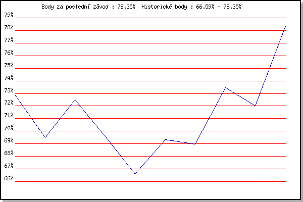 Závod| Body | Výkonnost | Změna | 17.11.2010 | 17.listopadu | 72.90% | 72.90% | | 3.3.2012 | Modrice | 69.49% | 71.40% | -1.50% | 11.3.2012 | Myslivna | 72.48% | 71.95% | +0.55% | 31.3.2012 | Cernohorsky soudek | 69.59% | 71.27% | -0.68% | 17.11.2012 | Jehnice | 66.59% | 70.43% | -0.84% | 9.3.2013 | Modrice | 69.33% | 70.13% | -0.30% | 24.3.2013 | Myslivna | 68.98% | 69.84% | -0.29% | 7.3.2015 | Modrice | 73.46% | 70.95% | +1.11% | 14.3.2015 | Myslivna | 72.02% | 71.26% | +0.31% | 7.4.2019 | Brnenska prehrada | 78.35% | 73.31% | +2.05% | | |