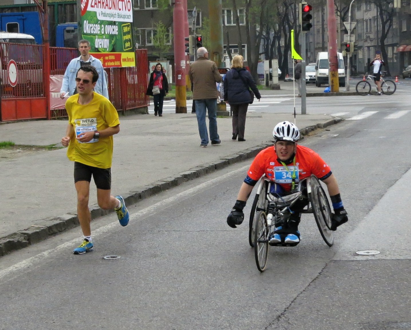 I letos jsem byl pověřen značením tratí všech závodů, značení jsme prováděli ráno pomocí fáborků, spolu s jedním člověkem. Trvalo nám to celkem dlouho, značili jsme 70 minut, ale snad jsme tratě vyznačili dobře. I když jsem byl dost oblečený, tak mi byla zima na prsty rukou, protože na nich jsem nemohl mít rukavice, neboť jsem stále z různých tašek tahal fáborky. :-) Po vyznačení jsem se pozdravil s nějakými lidmi, zaběhl do obchodu, posvačil a ještě vyřídil nějaký telefonický hovor. Převlékl jsem se doma, vzal jsem jen trenky, tričko, a navrch bundu s rukavicemi. Neměl jsem už moc čas, tak jsem na místo startu dal rozklus jen asi 2 km, měl jsem přitom dost vysokou tepovou frekvenci, čehož jsem si ale ani nevšiml. Na startu jsem si ještě odskočil, pozdravil se s dalšími závodníky a přichystal se na start. Těsně před startem jsem sundal i bundu a též rukavice. Uvažoval jsem, jestli běžet v nich či nikoliv, ale zkušenosti posledních dní byly takové, že mi v rukavicích bývala při běhu zima, protože se ruce v nich moc nehýbaly, a protože potřebuji často smrkat, tak jsem to risknul bez nich. Mé letní oblečení pak vzbudilo komentáře různých závodníků i diváků, nicméně v průběhu závodu jsem byl teplotně v pohodě a i ruce jsem měl teplé. Pobavil mě jen jeden člověk, který se ptal, proč neběžím bosý. I toto mě napadlo, ale to bych dal jen pro lidový běh, kdybych ho běžel.