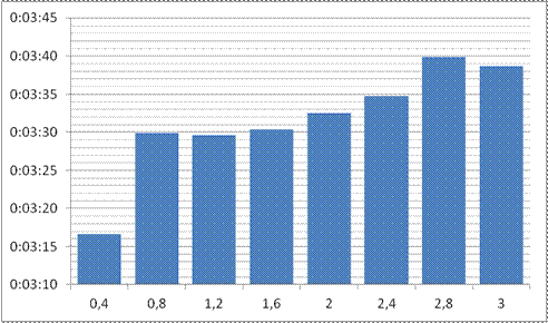 Vlasta bohužel běžel o něco rychleji, než plánoval, tak jsem neběžel s ním, ale kousek za ním, přesto jsem první kolo měl za necelých 1:24. Od druhého kola jsem už běžel sám, což vedlo k zpomalení, avšak běželo se mi dobře, první kilometr byl za 3:36. Rozhodl jsem se doběhnout až do trojky, druhý kilometr jsem měl za 3:46 a poslední za 3:52, limitující byla jen únava nohou, protože tep byl opět velmi nízký. Asi 300m před koncem jsem se zkusil přidat k probíhajícímu Vlastovi, který běhal své čtyřstovky, a uvolnil mu i cestu, aby nemusel brzdit, ale běžel moc rychle, tak jsem zvolnil a pokojně doběhl do cíle. Výsledný čas 11:13,9 je ale velmi slušný, za osobákem jsem zaostal jen o 19,9 sekundy, což po předchozích výkonech byl výborný výsledek. Tep byl přitom opět dost nízká, TFmax byla 179, jen těsně nad ANP, průměr byl jen 170. I přesto se jednalo o 12.nejrychlejší trojku v historii. Tento výsledek dává dobré šance pro další týdny, pokud budu odpočatý, dostatečně motivovaný a nejlépe pokud budu mít někoho, kdo poběží podobným tempem jako já.