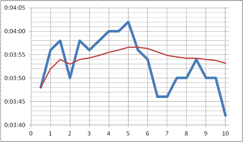 Od prvního kola jsem šel do vedení, protivítr na protilehlé rovince byl celkem nepříjemný, ale na cílové rovince pro změnu foukalo do zad, což nebylo špatné. Bohužel se mi ale neběželo moc dobře a tempo stále klesalo, i když tep zas tak nízký nebyl. Trochu jsem byl i zadýchaný, ale hlavně se nechtělo běžet nohám. Po 4 km za 15:30 již bylo jasné, že dnes 38:45 nedám. ;-) Kromě toho mi bylo i celkem teplo. Uvažoval jsem, že vezmu vodu, ale rozhodl jsem se, že napřed doběhnu pětku. Další kilometr jsem měl za 4:06, pětku tedy za 19:36, což nevypadalo dobře. Blížil jsem se k Mirkovi, který se nakonec rozhodl běžet jen pětku, ale těsně jsem ho o kolo nedoběhl. Bohužel i Karel s Alicí po pětce odstoupili, takže jsem v závodu na 10 km pokračoval jen sám, což pro mou psychiku nebylo též ideální. Po 5,6.km jsem vzal láhev s vodou, napil se, polil si obličej a trochu i vlasy, což vysvětluje skokové zpomalení v grafu před 6.km, které jsem měl za 31:46, takže pro cílový čas 39:30 by bylo třeba běhat tempem kolem 3:55/km, tedy o dost rychleji než dosud.