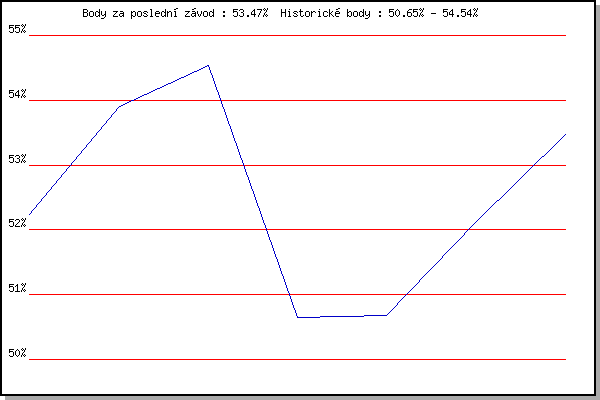 Závod| Body | Výkonnost | Změna | 14.05.2008 | Pisárky Anthropos, 6.3 km | 52.24% | 52.24% | | 21.05.2008 | Obřany, 8.8 km | 53.91% | 53.40% | +1.16% | 28.05.2008 | Líšeň Mariánské údolí, 11.1 km | 54.54% | 54.10% | +0.70% | 06.06.2018 | Pisárky Anthropos, 6 km | 50.65% | 53.22% | -0.88% | 20.06.2018 | Palackého vrch, 7.1 km | 50.68% | 52.48% | -0.74% | 11.07.2018 | Hotel Myslivna, 7 km | 52.11% | 52.47% | -0.01% | 18.07.2018 | Obřany, 8.8 km | 53.47% | 52.91% | +0.44% | | |