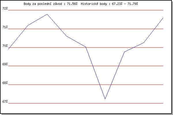 Závod| Body | Výkonnost | Změna | 23.07.2014 | Pisárky Anthropos, 6 km | 69.92% | 69.91% | | 06.08.2014 | Obřany, 8.8 km | 71.18% | 70.80% | +0.89% | 27.08.2014 | Popůvky, 5.3 km | 71.79% | 71.39% | +0.59% | 27.05.2015 | Obřany, 8.8 km | 70.61% | 71.17% | -0.22% | 22.07.2015 | Pisárky Anthropos, 6 km | 70.03% | 70.84% | -0.33% | 27.07.2016 | Palackého vrch, 7.1 km | 67.23% | 70.37% | -0.47% | 10.08.2016 | Hotel Myslivna, 7 km | 69.76% | 70.37% | 0.00% | 24.08.2016 | Popůvky, 7.9 km | 70.25% | 70.38% | +0.01% | 09.08.2017 | Hotel Myslivna, 7 km | 71.58% | 70.76% | +0.38% | | |