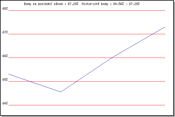 Závod| Body | Výkonnost | Změna | 11.06.2008 | Pisárky Anthropos, 6.3 km | 65.31% | 65.31% | | 16.07.2008 | Pisárky Anthropos, 6.3 km | 64.56% | 64.98% | -0.33% | 25.07.2012 | Pisárky Anthropos, 6 km | 66.02% | 65.56% | +0.58% | 05.09.2012 | Popůvky, 7.9 km | 67.29% | 66.38% | +0.82% | | |