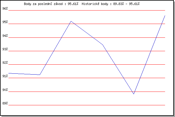 Závod| Body | Výkonnost | Změna | 13.08.2014 | Atletický stadión Pod Palackého vrche | 91.36% | 91.36% | | 12.08.2015 | Atletický stadión Pod Palackého vrche | 91.25% | 91.31% | -0.05% | 18.05.2016 | Palackého vrch, 7.1 km | 95.21% | 93.33% | +2.02% | 07.06.2017 | Pisárky Anthropos, 6 km | 93.48% | 93.57% | +0.24% | 30.08.2017 | Atletický stadión Pod Palackého vrche | 89.83% | 92.72% | -0.85% | 09.05.2018 | Popůvky, 7.9 km | 95.61% | 93.90% | +1.18% | | |