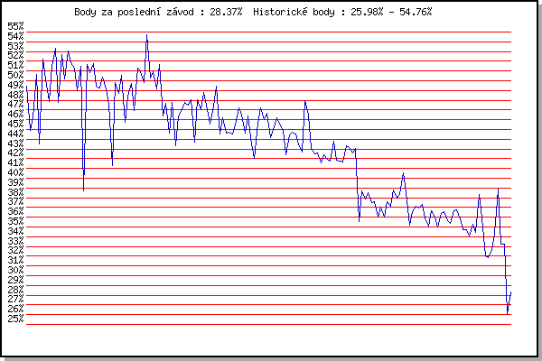 ZávodBodyVýkonnostZměna| 24.05.2006 | Obřany, 8.8 km | 49.44% | 49.45% | | | 31.05.2006 | Palackého vrch vodárna, 9 km | 44.88% | 47.47% | -1.98% | | 07.06.2006 | Líšeň Mariánské údolí, 11.1 km | 46.31% | 47.14% | -0.33% | | 14.06.2006 | Veselka, Popůvky Vintrovna, 7.9 km | 50.65% | 48.84% | +1.70% | | 22.06.2006 | Palackého vrch dráha, 5 km | 43.53% | 47.54% | -1.30% | | 28.06.2006 | Pisárky Anthropos, 6.6 km | 52.21% | 49.43% | +1.89% | | 12.07.2006 | Obřany, 8.8 km | 50.18% | 49.96% | +0.53% | | 19.07.2006 | Líšeň Mariánské údolí, 11.1 km | 47.83% | 49.60% | -0.36% | | 25.07.2006 | Veselka Popůvky Vintrovna, 7.9 km | 51.49% | 50.33% | +0.73% | | 02.08.2006 | Pisárky Anthropos, 6.6 km | 53.31% | 51.32% | +0.99% | | 09.08.2006 | Palackého vrch, 9 km | 47.81% | 50.58% | -0.74% | | 16.05.2007 | Pisárky Anthropos, 6.6 km | 52.64% | 51.27% | +0.69% | | 23.05.2007 | Obřany, 8.8 km | 50.15% | 51.16% | -0.11% | | 30.05.2007 | Líšeň Mariánské údolí, 11.1 km | 53.08% | 51.84% | +0.68% | | 06.06.2007 | Veselka, Popůvky Vintrovna, 7.9 km | 51.88% | 51.99% | +0.15% | | 13.06.2007 | Pisárky Anthropos, 6.6 km | 51.31% | 51.91% | -0.08% | | 20.06.2007 | Palackého vrch Běh Olympijského dne | 48.97% | 51.38% | -0.53% | | 27.06.2007 | Obřany, 8.8 km | 51.47% | 51.53% | +0.15% | | 04.07.2007 | Líšeň Mariánské údolí, 11.1 km | 38.69% | 50.82% | -0.71% | | 11.07.2007 | Veselka, Popůvky Vintrovna, 7.9 km | 51.69% | 51.26% | +0.44% | | 18.07.2007 | Moravská Slávia dráha, 15 km | 50.79% | 51.27% | +0.01% | | 14.05.2008 | Pisárky Anthropos, 6.3 km | 51.75% | 51.51% | +0.24% | | 21.05.2008 | Obřany, 8.8 km | 49.48% | 51.11% | -0.40% | | 28.05.2008 | Líšeň Mariánské údolí, 11.1 km | 49.24% | 50.75% | -0.36% | | 04.06.2008 | Veselka, Popůvky Vintrovna, 9.6 km | 50.39% | 50.73% | -0.02% | | 18.06.2008 | Obřany, 8.8 km | 49.16% | 50.43% | -0.30% | | 21.06.2008 | Běh kolem Mohyly míru, 12.3 km | 47.57% | 50.09% | -0.34% | | 09.07.2008 | Veselka, Popůvky Vintrovna, 7.9 km | 41.30% | 49.40% | -0.69% | | 13.05.2009 | Pisárky Anthropos, 6.3 km | 49.82% | 49.75% | +0.35% | | 20.05.2009 | Obřany, 8.8 km | 48.68% | 49.59% | -0.16% | | 27.05.2009 | Líšeň Mariánské údolí, 11.1 km | 50.53% | 49.92% | +0.33% | | 03.06.2009 | Veselka, Popůvky Vintrovna, 7.9 km | 45.74% | 49.25% | -0.67% | | 10.06.2009 | Pisárky Anthropos, 6.3 km | 48.41% | 49.21% | -0.04% | | 17.06.2009 | Obřany, 8.8 km | 49.75% | 49.50% | +0.29% | | 24.06.2009 | Palackého vrch Běh Olympijského dne | 46.91% | 49.00% | -0.50% | | 01.07.2009 | Líšeň Mariánské údolí, 11.1 km | 51.26% | 49.67% | +0.67% | | 08.07.2009 | Veselka, Popůvky Vintrovna, 7.9 km | 50.92% | 50.12% | +0.45% | | 15.07.2009 | Pisárky Anthropos, 6.3 km | 49.79% | 50.18% | +0.06% | | 22.07.2009 | Moravská Slavia dráha, 15 km | 54.76% | 51.45% | +1.27% | | 29.07.2009 | Obřany, 8.8 km | 50.28% | 51.28% | -0.17% | | 05.08.2009 | Líšeň Mariánské údolí, 11.1 km | 50.91% | 51.27% | -0.01% | | 12.08.2009 | Veselka, Popůvky Vintrovna, 7.9 km | 49.20% | 50.88% | -0.39% | | 19.08.2009 | Moravská Slavia dráha, 10 km | 51.70% | 51.18% | +0.30% | | 08.05.2010 | Běh o pohár pivovaru Černá hora, 9. | 46.37% | 50.62% | -0.56% | | 12.05.2010 | Pisárky Anthropos, 6.3 km | 47.67% | 50.08% | -0.54% | | 19.05.2010 | Palackého vrch , 7.1 km | 44.63% | 49.36% | -0.72% | | 26.05.2010 | Obřany, 8.8 km | 47.77% | 49.12% | -0.24% | | 02.06.2010 | Líšeň Mariánské údolí, 11.1 km | 43.33% | 48.31% | -0.81% | | 16.06.2010 | Pisárky Anthropos, 6.3 km | 46.39% | 48.02% | -0.29% | | 23.06.2010 | Palackého vrch Běh Olympijského dne | 47.05% | 47.95% | -0.07% | | 30.06.2010 | Obřany, 8.8 km | 47.79% | 48.00% | +0.05% | | 07.07.2010 | Líšeň Mariánské údolí, 11.1 km | 47.46% | 47.95% | -0.05% | | 14.07.2010 | Veselka, Popůvky Vintrovna, 7.9 km | 48.06% | 48.05% | +0.10% | | 28.07.2010 | Pisárky Anthropos, 6.3 km | 43.72% | 47.49% | -0.56% | | 04.08.2010 | Palackého vrch , 7.1 km | 48.06% | 47.81% | +0.32% | | 11.08.2010 | Obřany, 8.8 km | 47.07% | 47.75% | -0.06% | | 18.08.2010 | Moravská Slavia dráha, 10 km | 48.79% | 48.07% | +0.32% | | 25.08.2010 | Líšeň Mariánské údolí, 11.1 km | 46.99% | 47.85% | -0.22% | | 08.09.2010 | Pisárky Anthropos, 6.3 km | 45.59% | 47.51% | -0.34% | | 22.09.2010 | Moravská Slavia dráha, 15 km | 47.39% | 47.57% | +0.06% | | 28.09.2010 | Blažovice Svatováclavský běh, 9.4 km | 49.42% | 48.12% | +0.55% | | 11.05.2011 | Pisárky Anthropos, 6 km | 44.57% | 47.58% | -0.54% | | 18.05.2011 | Palackého vrch, 7.1 km | 46.21% | 47.38% | -0.20% | | 25.05.2011 | Obřany, 8.8 km | 44.64% | 46.85% | -0.53% | | 01.06.2011 | Líšeň Mariánské údolí, 11.1 km | 44.74% | 46.44% | -0.41% | | 08.06.2011 | Veselka, Popůvky Vintrovna, 7.9 km | 44.52% | 46.08% | -0.36% | | 15.06.2011 | Pisárky Anthropos, 6 km | 45.48% | 46.00% | -0.08% | | 23.06.2011 | Palackého vrch – Běh Olympijského dne | 47.18% | 46.37% | +0.37% | | 29.06.2011 | Obřany, 8.8 km | 46.50% | 46.49% | +0.12% | | 13.07.2011 | Popůvky, 7.9 km | 44.59% | 46.12% | -0.37% | | 20.07.2011 | AC Moravská Slávia, 5km atletický o | 46.42% | 46.27% | +0.15% | | 24.08.2011 | Líšeň Mariánské údolí, 11.1 km | 43.53% | 45.92% | -0.35% | | 31.08.2011 | Popůvky, 7.9 km | 42.00% | 45.45% | -0.47% | | 07.09.2011 | Pisárky Anthropos, 6 km | 45.67% | 45.61% | +0.16% | | 14.09.2011 | Líšeň Mariánské údolí, 11.1 km | 47.23% | 46.12% | +0.51% | | 21.09.2011 | AC Moravská Slávia Brno, 1hod atlet | 45.97% | 46.20% | +0.08% | | 28.09.2011 | Blažovice – Svatováclavský běh , 11 k | 46.62% | 46.38% | +0.18% | | 09.05.2012 | Pisárky Anthropos, 6 km | 44.13% | 45.96% | -0.42% | | 16.05.2012 | Palackého vrch, 7.1 km | 45.01% | 45.81% | -0.15% | | 23.05.2012 | Obřany, 8.8 km | 46.19% | 45.99% | +0.18% | | 30.05.2012 | Líšeň Mariánské údolí, 11 km | 45.56% | 45.96% | -0.03% | | 13.06.2012 | Pisárky A