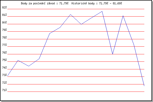 ZávodBodyVýkonnostZměna| 13.05.2015 | Pisárky Anthropos, 6 km | 73.09% | 73.09% | | | 20.05.2015 | Palackého vrch, 7.1 km | 75.16% | 74.54% | +1.45% | | 03.06.2015 | Líšeň, 11 km | 74.40% | 74.61% | +0.07% | | 10.06.2015 | Popůvky, 7.9 km | 75.38% | 75.03% | +0.42% | | 24.06.2015 | Palackého vrch, 7.1 km | 78.74% | 76.47% | +1.44% | | 05.08.2015 | Obřany, 8.8 km | 79.57% | 77.67% | +1.20% | | 19.08.2015 | Líšeň, 10.6 km | 81.27% | 79.00% | +1.33% | | 26.08.2015 | Popůvky, 7.9 km | 79.97% | 79.51% | +0.51% | | 25.05.2016 | Obřany, 8.8 km | 80.84% | 80.13% | +0.62% | | 01.06.2016 | Líšeň, 11 km | 81.69% | 80.72% | +0.59% | | 08.06.2016 | Popůvky, 7.9 km | 75.99% | 79.78% | -0.94% | | 20.07.2016 | Pisárky Anthropos, 6 km | 81.11% | 80.34% | +0.56% | | 23.05.2018 | Obřany, 8.8 km | 77.29% | 79.76% | -0.58% | | 15.07.2020 | Obřany, 8.8 km | 71.79% | 78.84% | -0.92% | | | | |