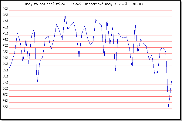 ZávodBodyVýkonnostZměna| 10.06.2015 | Popůvky, 7.9 km | 69.53% | 69.53% | | | 17.06.2015 | Pisárky Anthropos, 6 km | 70.65% | 70.31% | +0.78% | | 24.06.2015 | Palackého vrch, 7.1 km | 72.21% | 71.37% | +1.06% | | 22.07.2015 | Pisárky Anthropos, 6 km | 75.36% | 73.20% | +1.83% | | 29.07.2015 | Palackého vrch, 7.1 km | 73.89% | 73.64% | +0.44% | | 12.08.2015 | Atletický stadión Pod Palackého vrche | 70.59% | 72.83% | -0.81% | | 19.08.2015 | Líšeň, 10.6 km | 74.33% | 73.44% | +0.61% | | 02.09.2015 | Atletický stadión Pod Palackého vrche | 70.38% | 72.75% | -0.69% | | 09.09.2015 | Líšeň, 11 km | 74.84% | 73.49% | +0.74% | | 28.09.2015 | Blažovice – Svatováclavský běh, 11 km | 76.00% | 74.36% | +0.87% | | 20.04.2016 | Atletický stadión Pod Palackého vrche | 67.13% | 73.42% | -0.94% | | 11.05.2016 | Popůvky, 7.9 km | 70.76% | 72.95% | -0.47% | | 18.05.2016 | Palackého vrch, 7.1 km | 71.41% | 72.68% | -0.27% | | 25.05.2016 | Obřany, 8.8 km | 74.50% | 73.27% | +0.59% | | 01.06.2016 | Líšeň, 11 km | 74.85% | 73.82% | +0.55% | | 08.06.2016 | Popůvky, 7.9 km | 72.67% | 73.67% | -0.15% | | 13.07.2016 | Atletický stadión Pod Palackého vrche | 74.34% | 73.98% | +0.31% | | 20.07.2016 | Pisárky Anthropos, 6 km | 76.79% | 74.83% | +0.85% | | 27.07.2016 | Palackého vrch, 7.1 km | 75.81% | 75.20% | +0.37% | | 10.08.2016 | Hotel Myslivna, 7 km | 74.33% | 75.11% | -0.09% | | 17.08.2016 | Líšeň, 11 km | 78.31% | 76.01% | +0.90% | | 24.08.2016 | Popůvky, 7.9 km | 75.91% | 76.07% | +0.06% | | 31.08.2016 | Atletický stadión Pod Palackého vrche | 76.63% | 76.29% | +0.22% | | 07.09.2016 | Pisárky Anthropos, 6 km | 77.14% | 76.60% | +0.31% | | 26.04.2017 | Pisárky Anthropos, 6 km | 75.36% | 76.40% | -0.20% | | 03.05.2017 | Hotel Myslivna, 7 km | 71.28% | 75.82% | -0.58% | | 17.05.2017 | Palackého vrch, 7.1 km | 75.25% | 75.87% | +0.05% | | 24.05.2017 | Obřany, 8.8 km | 76.53% | 76.12% | +0.25% | | 07.06.2017 | Pisárky Anthropos, 6 km | 74.53% | 75.82% | -0.30% | | 21.06.2017 | Palackého vrch, 7.1 km | 73.46% | 75.41% | -0.41% | | 28.06.2017 | Obřany, 8.8 km | 73.86% | 75.12% | -0.29% | | 12.07.2017 | Atletický stadión Pod Palackého vrche | 77.54% | 75.82% | +0.70% | | 19.07.2017 | Pisárky Anthropos, 6 km | 77.12% | 76.24% | +0.42% | | 26.07.2017 | Palackého vrch, 7.1 km | 76.59% | 76.45% | +0.21% | | 09.08.2017 | Hotel Myslivna, 7 km | 71.32% | 75.80% | -0.65% | | 16.08.2017 | Obřany, 8.8 km | 77.55% | 76.43% | +0.63% | | 30.08.2017 | Atletický stadión Pod Palackého vrche | 73.44% | 75.84% | -0.59% | | 06.09.2017 | Líšeň, 11 km | 76.33% | 76.08% | +0.24% | | 02.05.2018 | Hotel Myslivna, 7 km | 69.17% | 75.31% | -0.77% | | 30.05.2018 | Líšeň, 11 km | 75.32% | 75.51% | +0.20% | | 06.06.2018 | Pisárky Anthropos, 6 km | 74.70% | 75.49% | -0.02% | | 13.06.2018 | Atletický stadión Pod Palackého vrche | 74.56% | 75.36% | -0.13% | | 20.06.2018 | Palackého vrch, 7.1 km | 74.73% | 75.29% | -0.07% | | 27.06.2018 | Popůvky, 7.9 km | 72.91% | 74.87% | -0.42% | | 11.07.2018 | Hotel Myslivna, 7 km | 69.59% | 74.22% | -0.65% | | 25.07.2018 | Líšeň, 11 km | 76.95% | 75.13% | +0.91% | | 29.08.2018 | Atletický stadión Pod Palackého vrche | 72.07% | 74.55% | -0.58% | | 05.09.2018 | Obřany, 8.8 km | 74.33% | 74.62% | +0.07% | | 12.09.2018 | Pisárky Anthropos, 6 km | 73.69% | 74.51% | -0.11% | | 17.04.2019 | Atletický stadión Pod Palackého vrche | 73.18% | 74.30% | -0.21% | | 24.04.2019 | Pisárky Anthropos, 6 km | 71.02% | 73.77% | -0.53% | | 05.06.2019 | Palackého vrch, 7.1 km | 71.74% | 73.40% | -0.37% | | 12.06.2019 | Popůvky, 7.9 km | 68.80% | 72.86% | -0.54% | | 19.06.2019 | Atletický stadión Pod Palackého vrche | 68.95% | 72.09% | -0.77% | | 26.06.2019 | Pisárky Anthropos, 6 km | 72.71% | 72.40% | +0.31% | | 03.07.2019 | Obřany, 8.8 km | 72.99% | 72.72% | +0.32% | | 17.07.2019 | Palackého vrch, 7.1 km | 72.27% | 72.78% | +0.06% | | 11.09.2019 | Pisárky Anthropos, 6 km | 63.30% | 72.03% | -0.75% | | 16.09.2020 | Atletický stadión Pod Palackého vrche | 67.52% | 71.15% | -0.88% | | | | |